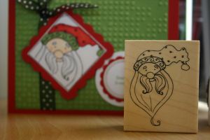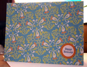 I love simple cards! This card is from the Citrus box of cards by DCWV. I punched an orange circle with the 1″ EK Success punch and a white circle with the 3/4″ EK success punch. Then stamped A105 on the white circle with the Aegean Blue VersaMark Dew Drop inkpad. Some alternatives for A105 are A30 (happy b-day), A109 (to you!), A136 (thinking of you), or A117 (hello).