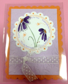 These are cards made at the Columbia, SC show. It was a color challenge of periwinkle and tangerine. The top card’s colors are our orange fizz and berrylicious, the closest I can come to those colors. Bottom card’s colors are grape jelly and orange fizz. Stamps used: F194 Swiss Dot, C197 Handmade, AA14 Firefly, G17 Retro Daisies, B208 KB’s Duo Daisies Sm, G302 KB’s Duo Daisies Lg
