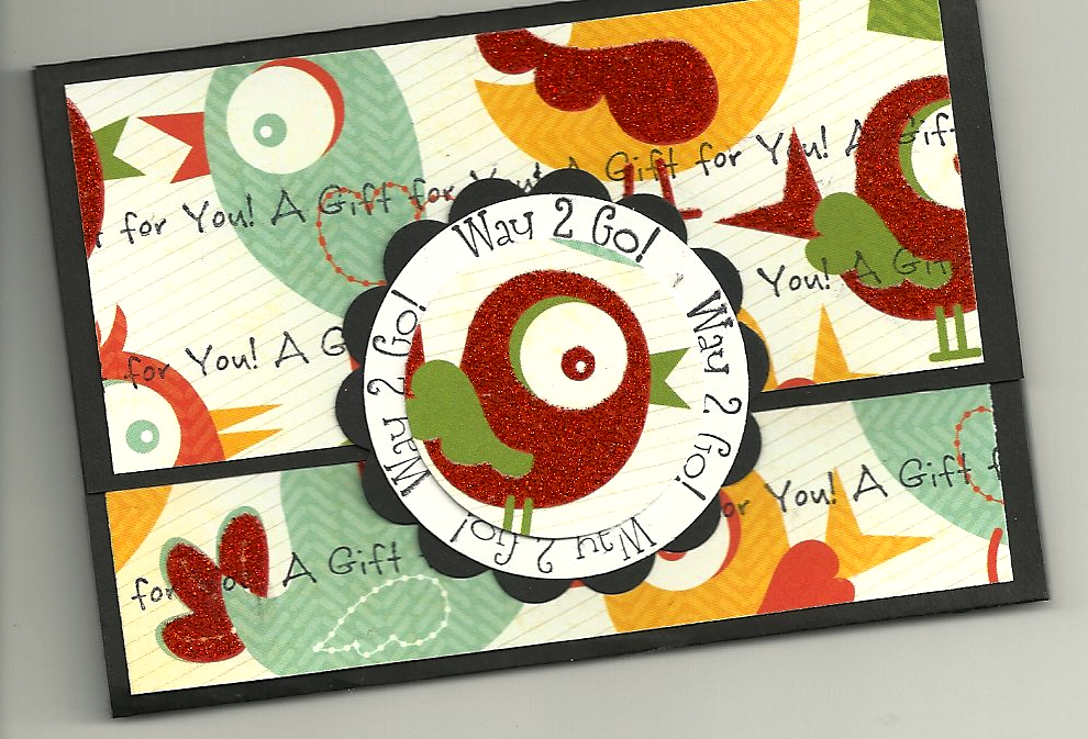 Well, we made it to Akron, OH! It seemed like a long drive but we were listening to The Girl who Played with Fire and it is a good book. Once we made it here we went to brush our teeth only to discover we left one suitcase at home! ugh! So Wal-Mart here we come today. Crazy! But here is another card for the make n takes this weekend!