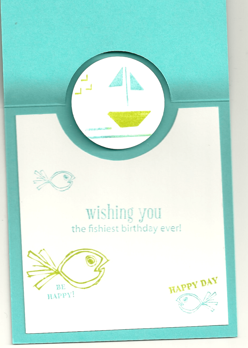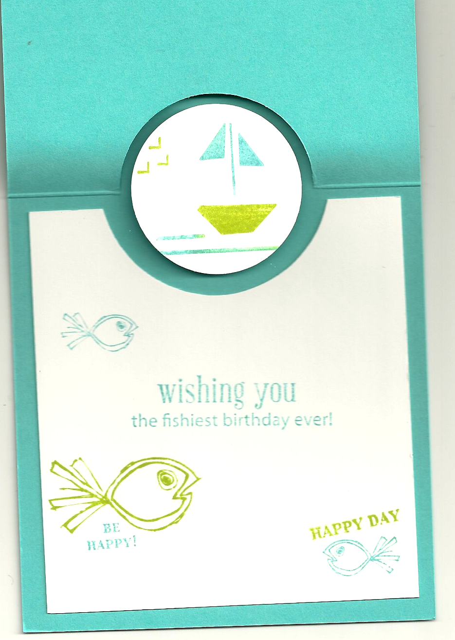 We have started working on new make n takes for in our booth! They are very cute! Here is the first one. This card is made with what we call Fish One…we also have Fish Two…you’ll see that tomorrow! We are using The Paper Cut, Inc. Bib Cards for this card. Blu Raspberry Bib Card with Sour Apple Overlay.