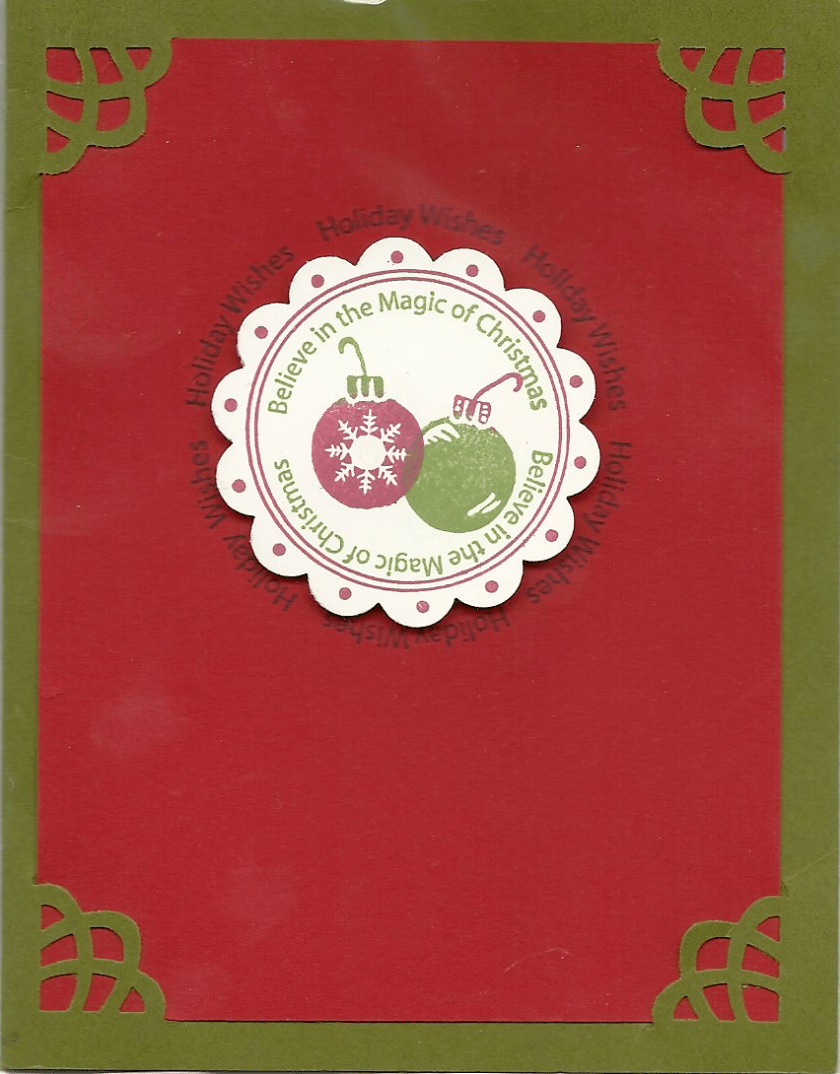 November 27, 2012 Christmas Cards If you’re still looking for an easy Christmas card. This one is it! Looks like work but is not! You just need to know how to use your stamp-a-ma-jig! You can always omit the Believe in the magic and it would be really quick!