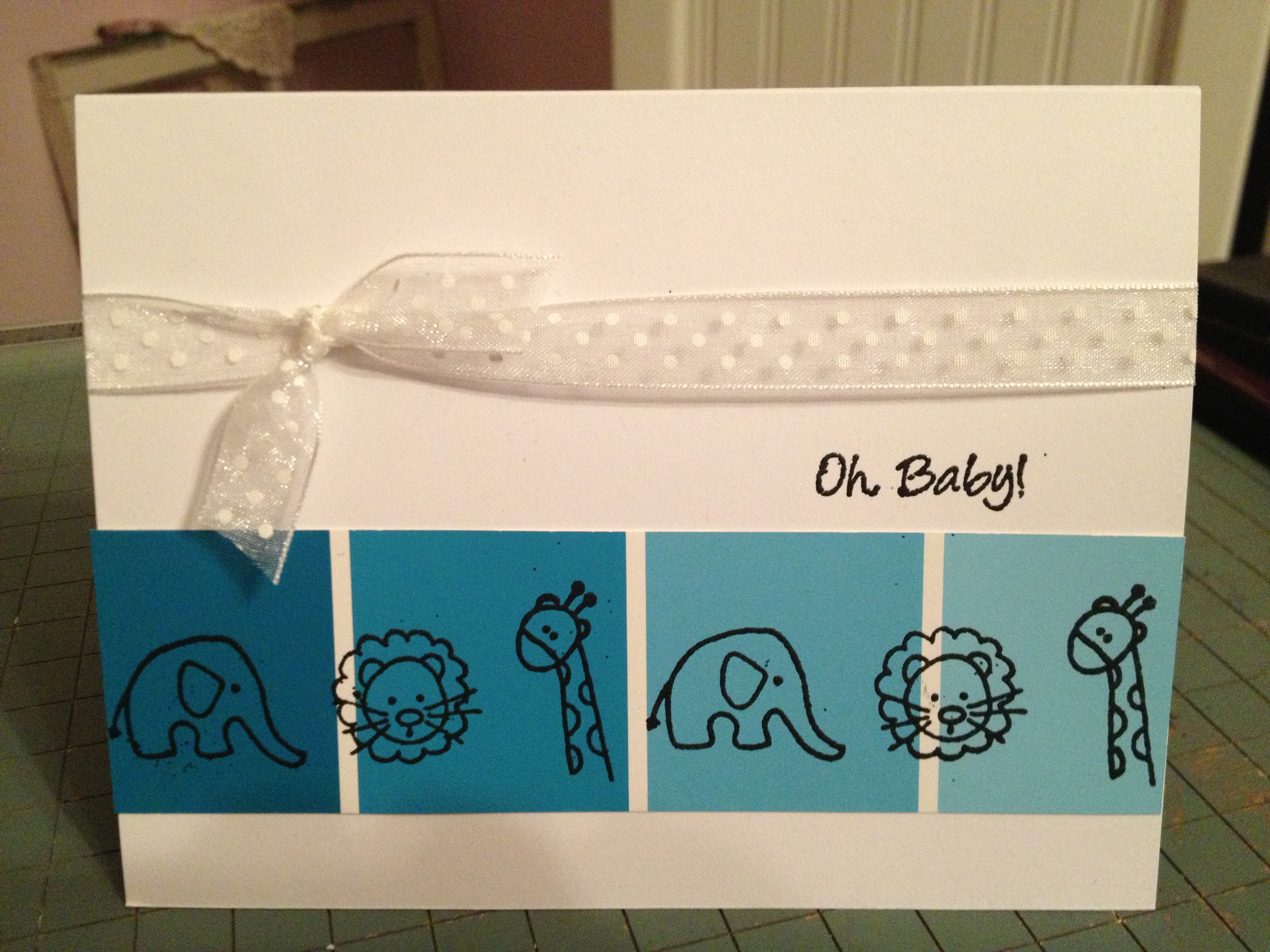 oh baby paint chipSo I got a chance to use the new stamps today!  It was so exciting. I love new stamps.  Many of Karissa’s friends are having babies so she has been designing baby stamps.  I love how simple and cute this is.  It’s probably hard to guess the background?! a paint chip.  Yep, we’ve been painting a lot lately and so I have paint chips that I just couldn’t resist using!