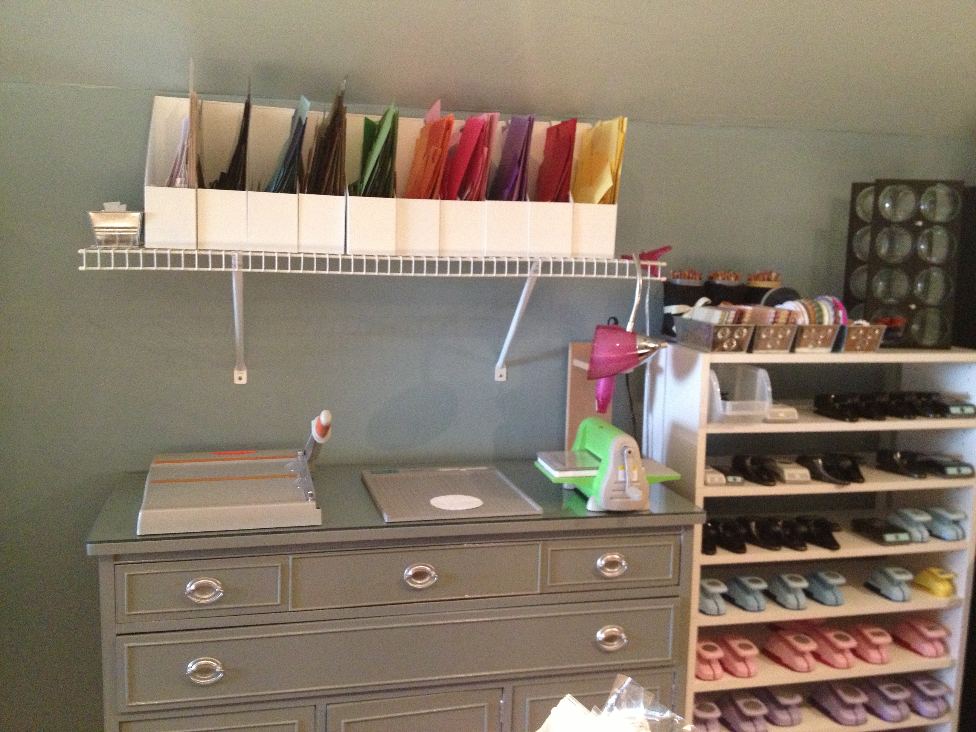 I think this is my favorite part of the studio! I have all my scraps organized above my cutting in magazine holders I got at Ikea. I was going to get cardboard ones and Karissa talked me into these metal ones and I’m so glad! They are very sturdy and work well. I do have a light clipped on the shelf and behind that light is actually my embossing tool in a little stand. The shoe racks work great for punches…especially the punches I use all the time. On the top of the shoe rack to the right is a wine rack with glass vases that I got from the dollar store. The wine rack cost $0.75 at goodwill and the glass vases were $1.00 each. It’s for future expansion! I was going to use it for my prismacolor pencils and water color pencils but they are in lego containers decorated with burlap behind the metal tins. They work well there so not sure if I’m going to change them or not.
