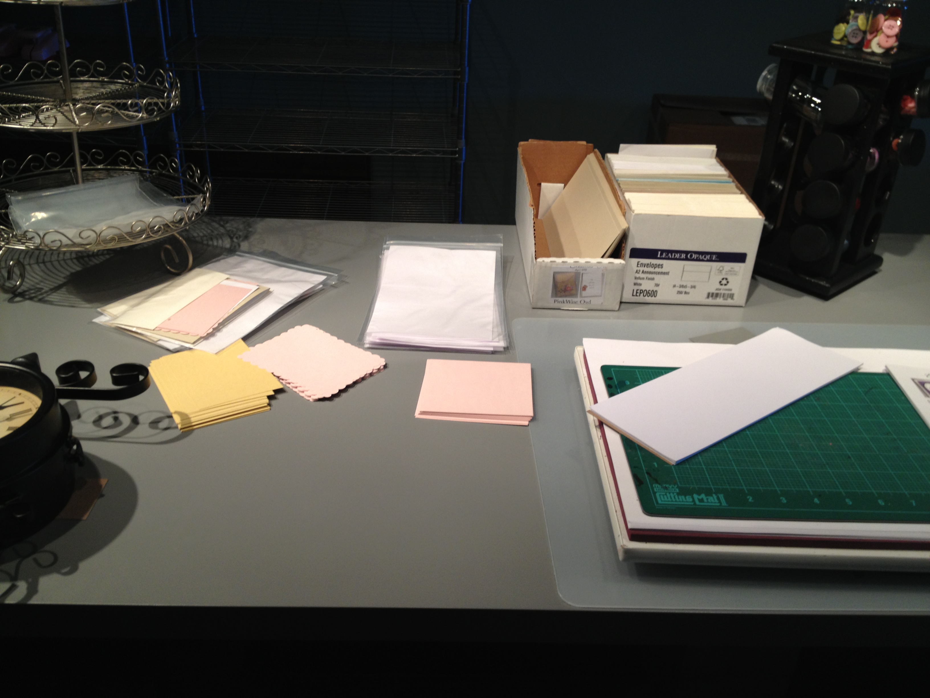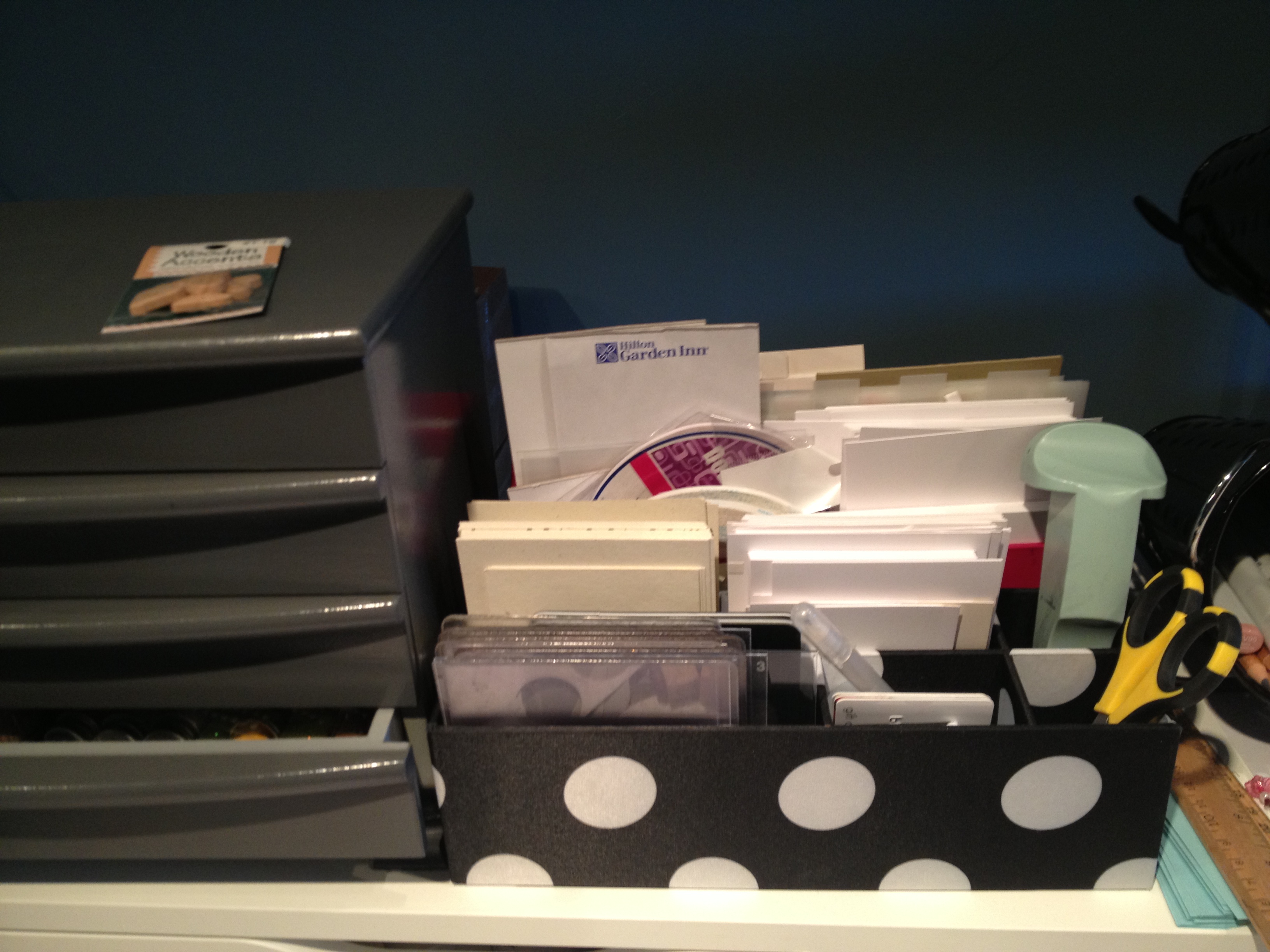So I have this handy file box that is black with white polka dots! It fits perfectly in the studio and I love polka dots…it actually came in a organizer for bath products! Re- purpose , Re-use, that’s my motto! It has nice little compartments to hold things up. In this case I have everything I use often. My Stamp a ma Jig with all the plastic pieces, a scissors, white cardstock, 3-d-dots, a perfectly random template…just those things I use regularly.