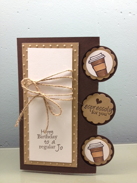 I like the new coffee stamps. We are working on a coffee fun cube too so watch for that. Stamps Used: C235 Regular Jo; B273 Espressoly for You; A190 Mini Heart; B226 KB’s Capp Cup sm
