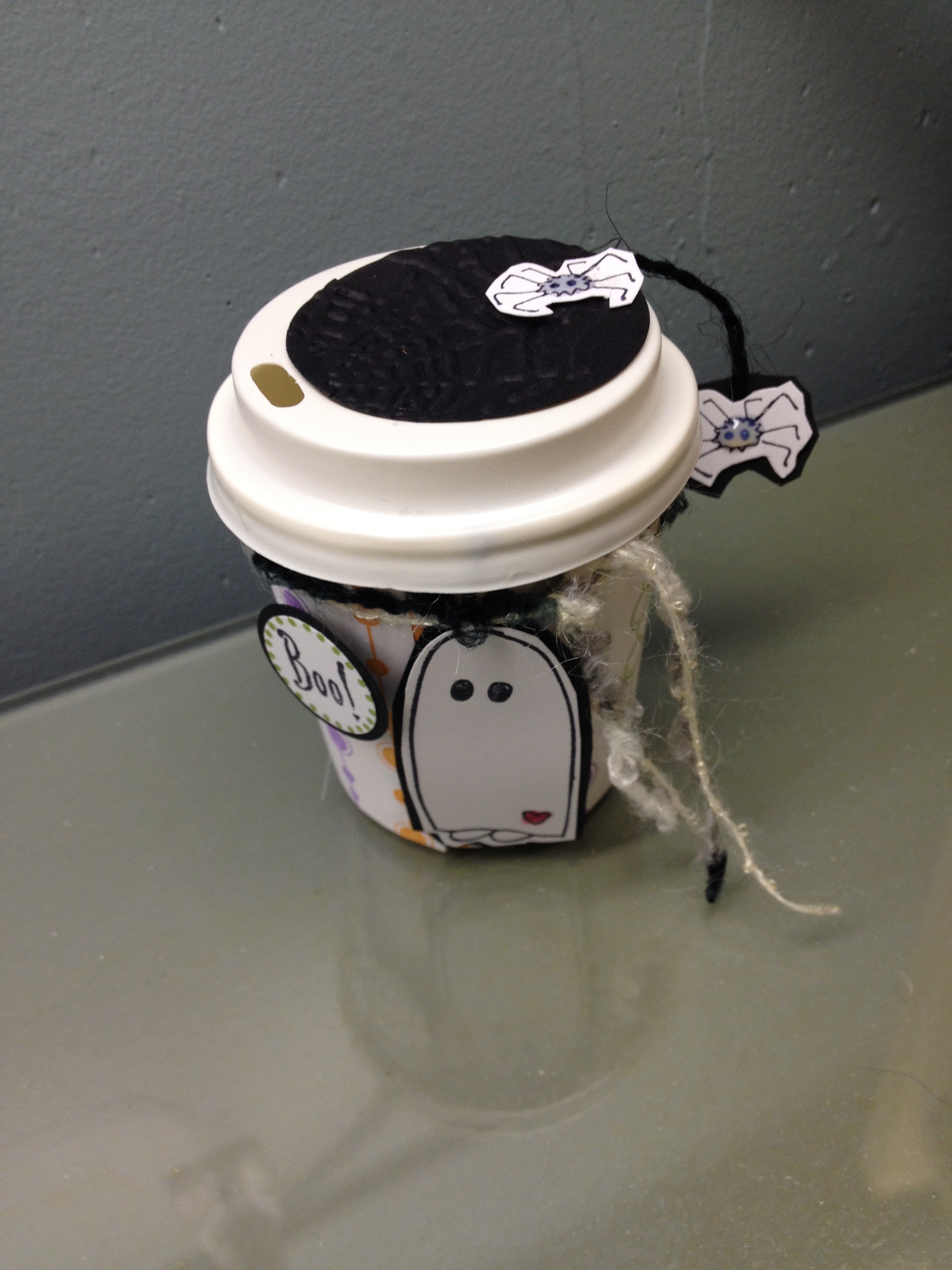 I got my box of 4 oz coffee cups and lids! These are tiny plain coffee cups that you can decorate into a treat cup…how cute are they!?? I wish that I would have had some yarn in fun colors other than black and white but we are headed into town soon to go truck shopping (ugh, not so fun) but they have stores down there and soon I will be the proud owner of orange, purple, green and whatever other 🙂 color yarn!