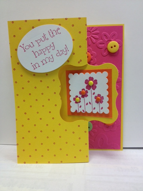This adorable flip card comes from my friend Sarah at The Paper Cut, Inc. It uses their Topnote Z Fold Card. Very bright and cheerful colors!