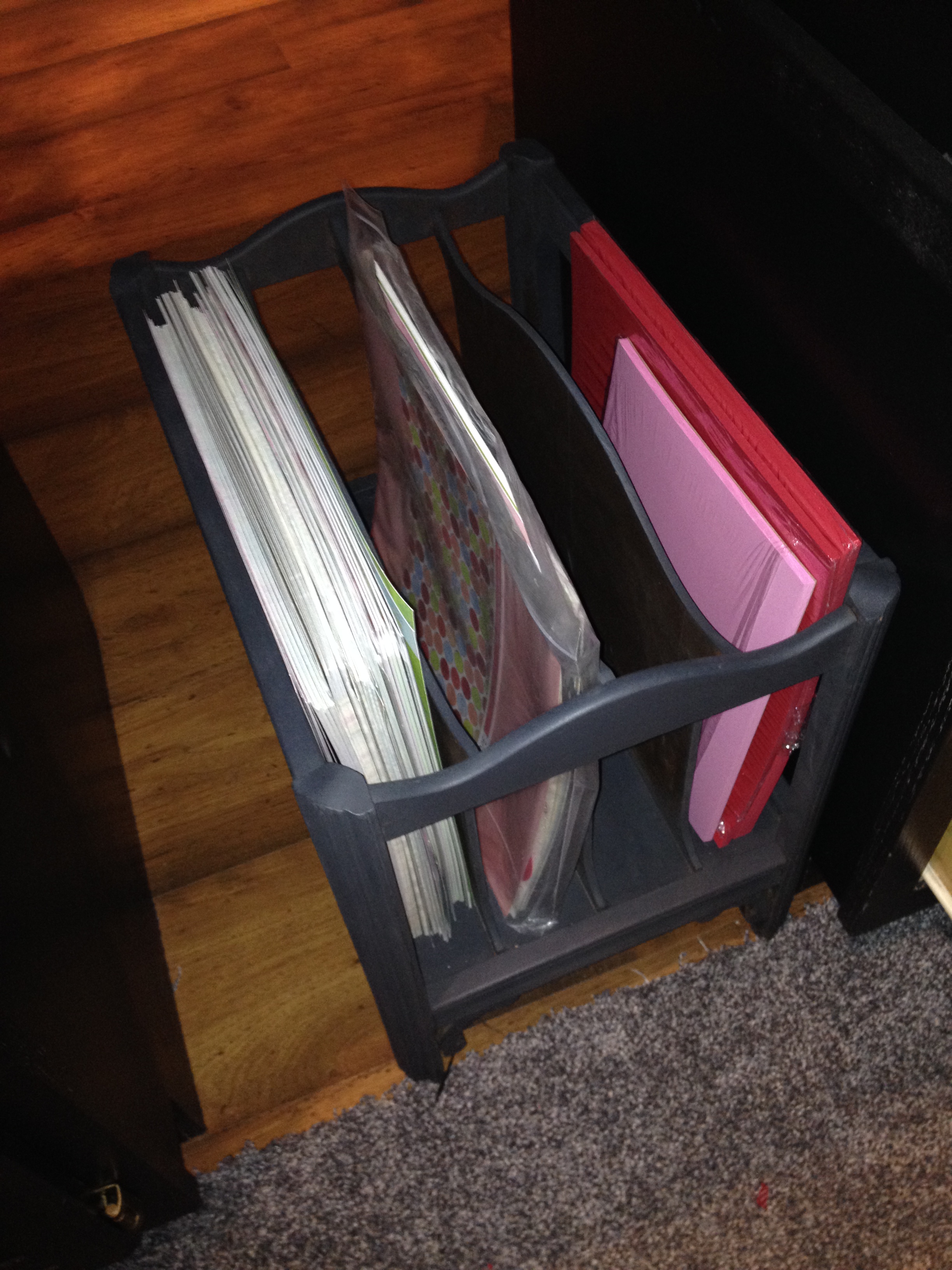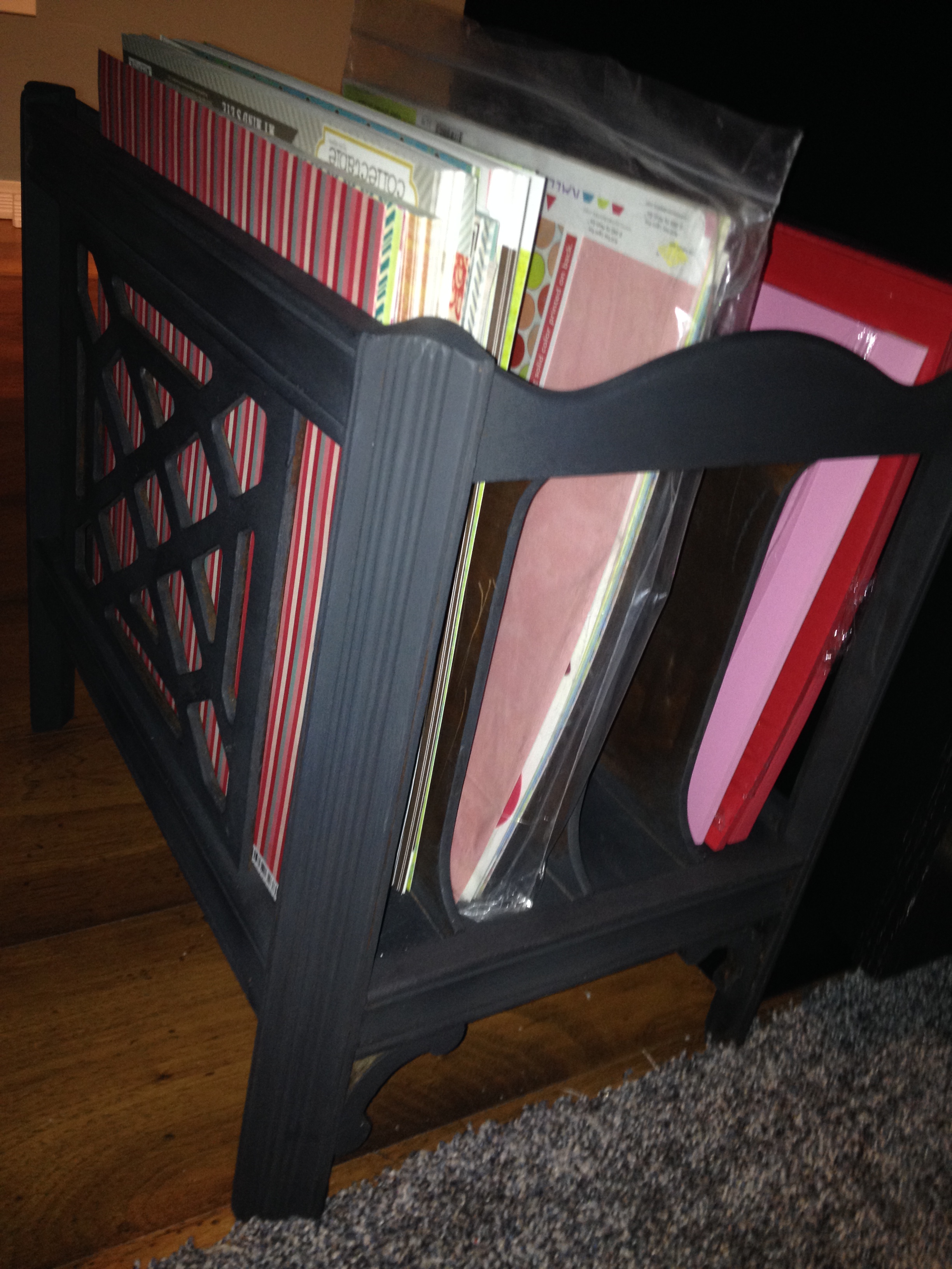 This weekend I finished two projects in my garage. One is a little entry way table and the other is a little magazine rack that I found at a local thrift store for $2 and it holds 12×12 perfectly! It was an ugly brown so I changed it to an awesome grey with a hint of brown. Happy with it!