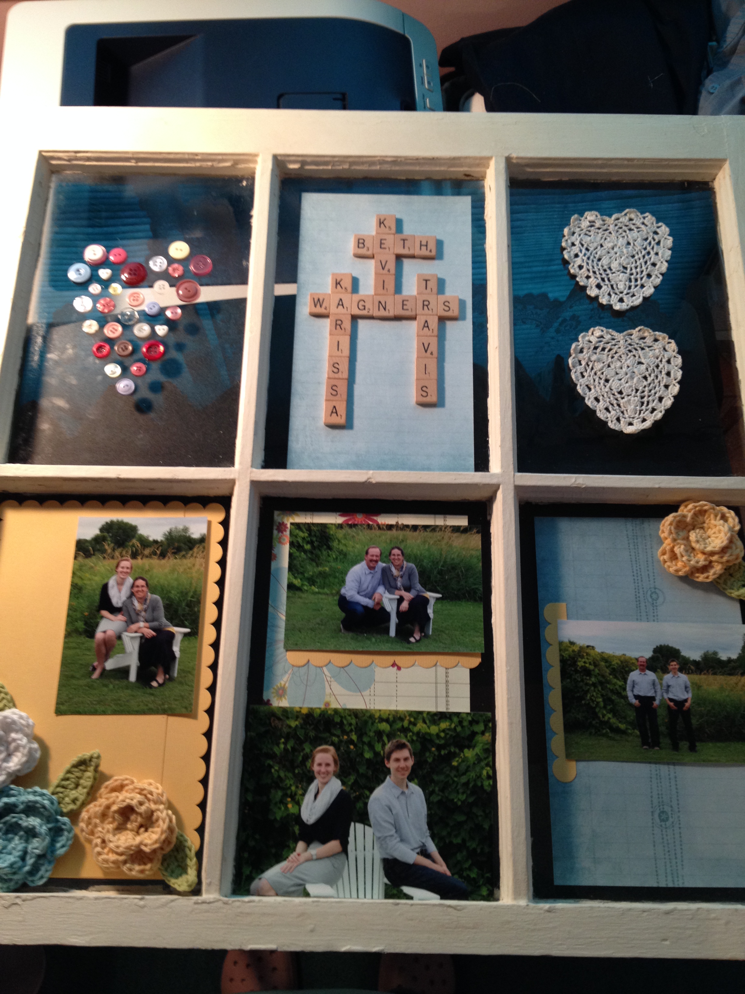 before our son left home this summer we had some family pictures taken. I had this old window that I bought with my birthday money from my Mom. I love using my birthday money from my Mom and Dad for special things. It just puts a smile on my face when I see the things in the house and remember my parents and just little things they do like birthday cards with money! 🙂