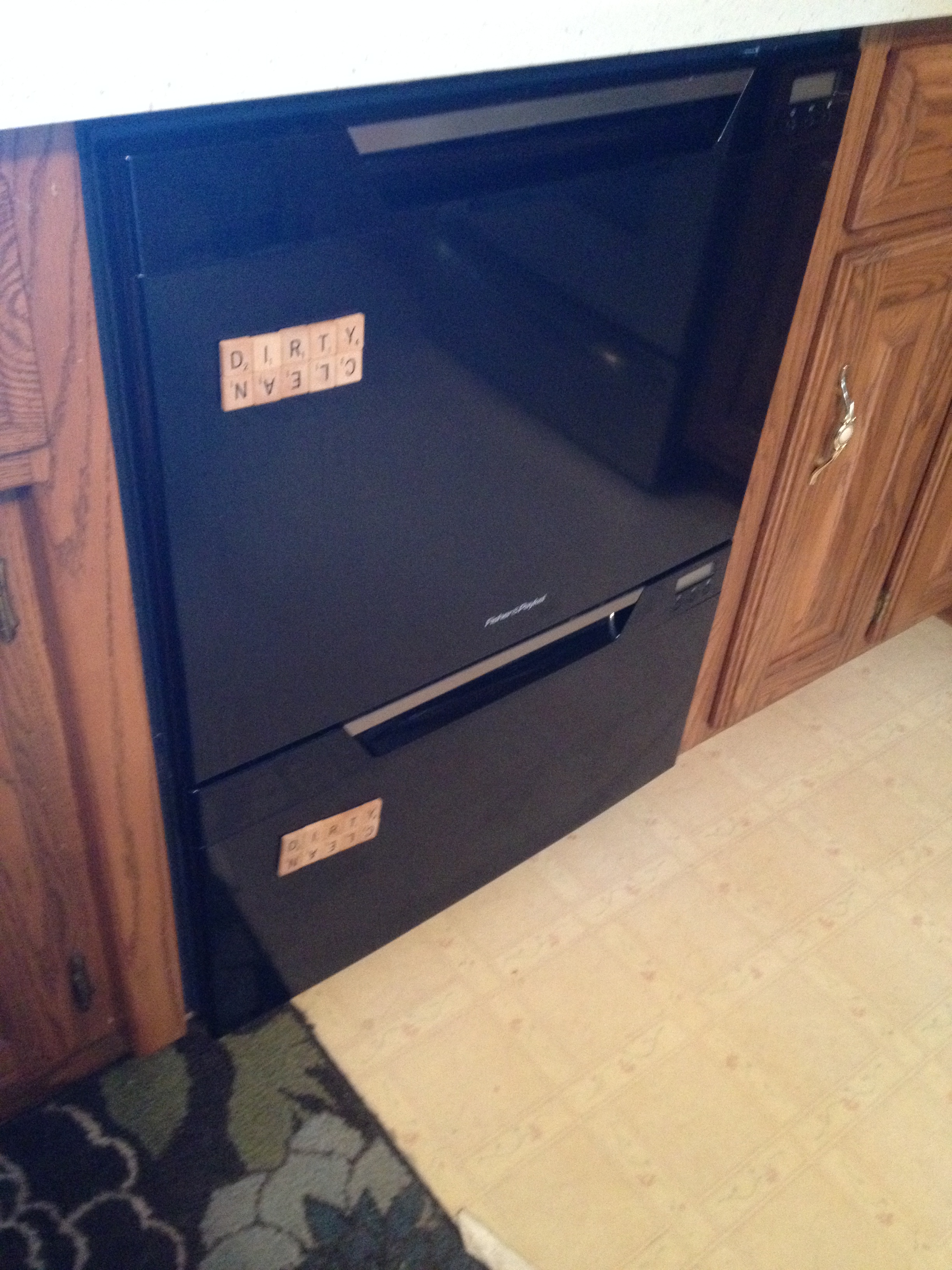 my dishwasher is actually two drawers! I love it. With just Kevin and I it’s nice to run small loads. And yet when my sister and her family come over it holds everything! It actually got terrible reviews online but I really like the machine. It cleans well and loads great. I think I needed the signs to keep track of what was clean and what wasn’t!