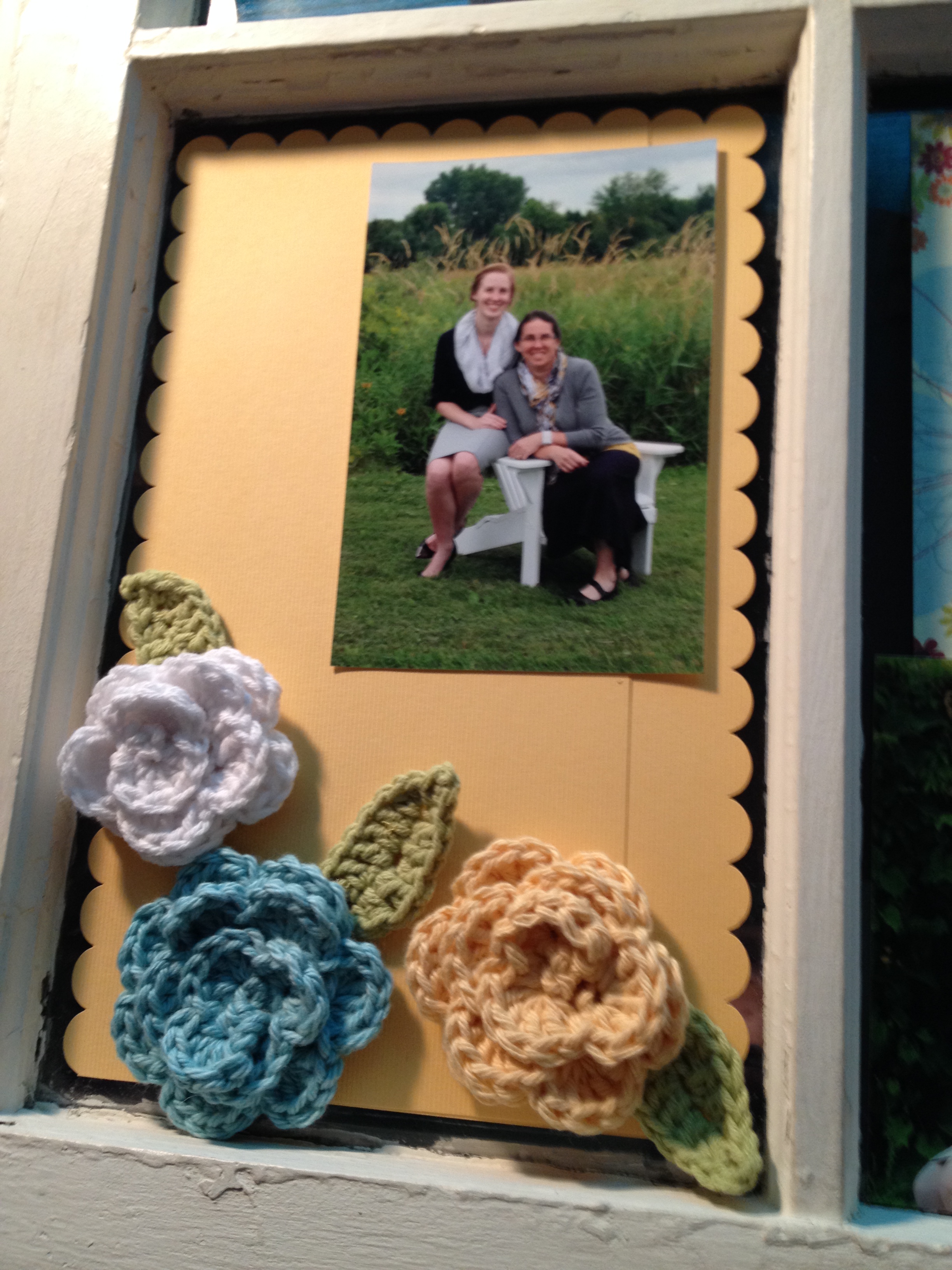 Here’s another frame from my old window. I’ve been crocheting these little flowers. They are so much fun and only take a few minutes!