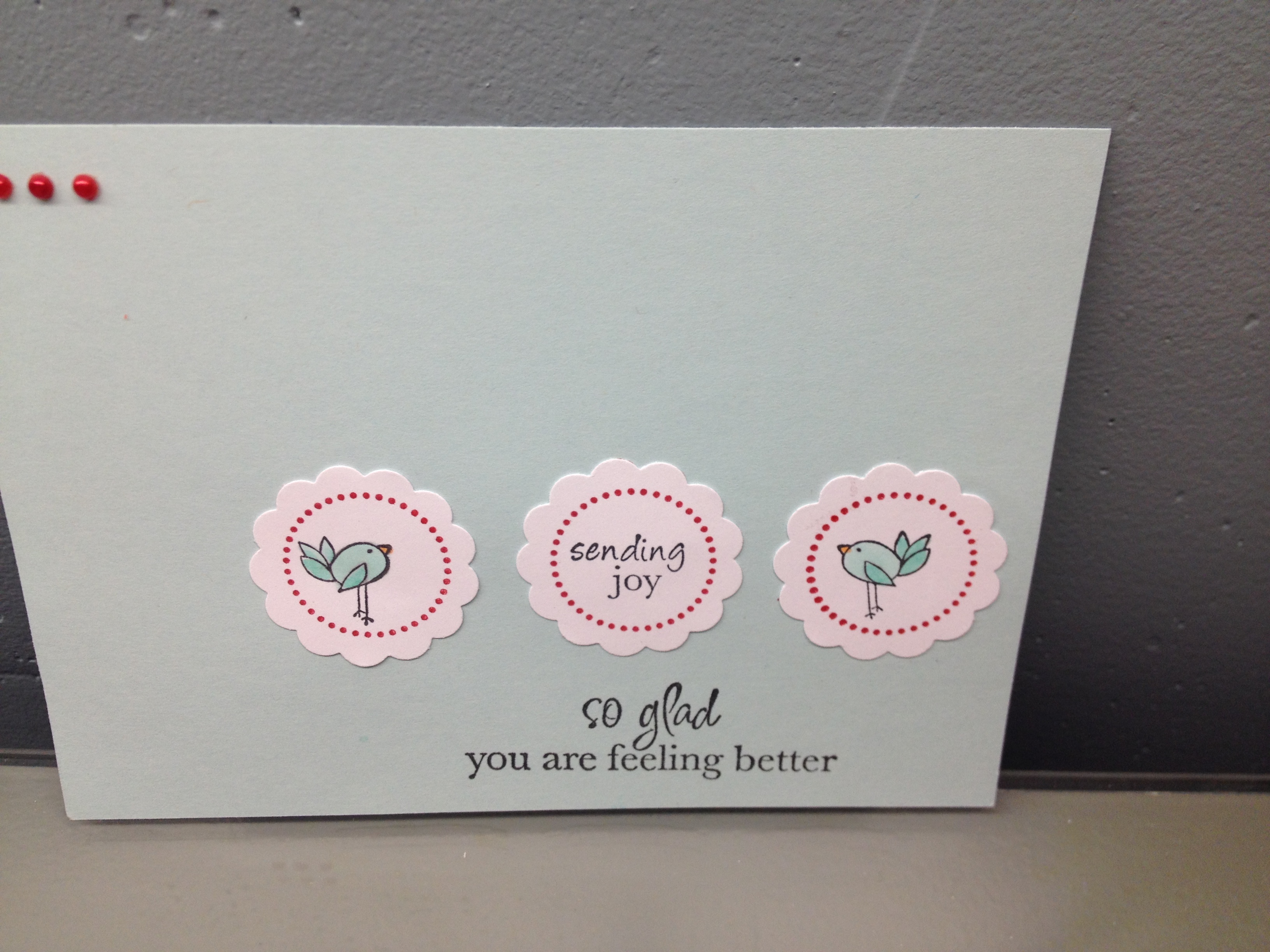 I’ve been using some of our newer stamps for the displays in our booth and really like the ones just to send someone a cheer up card. I try to take three matching papers and then fill the display with cards that all match. Doesn’t always work but I do like how it looks when it does work! So this card is good for those who are recovering from surgery, from a cold, or the flu or just whatever! Very clean and simple.