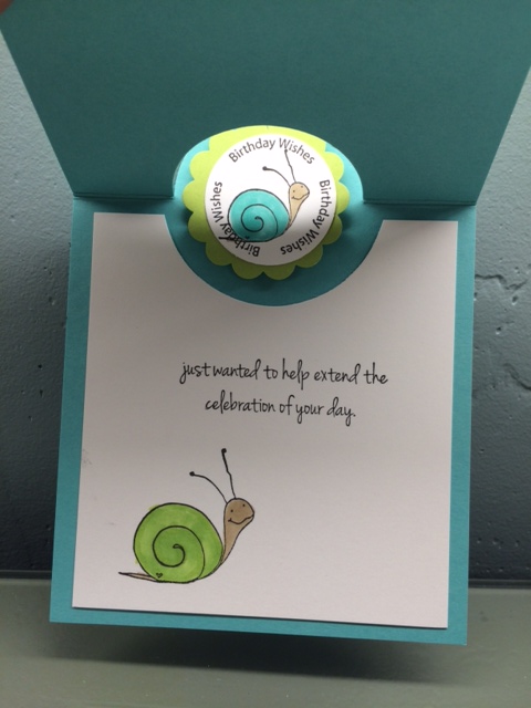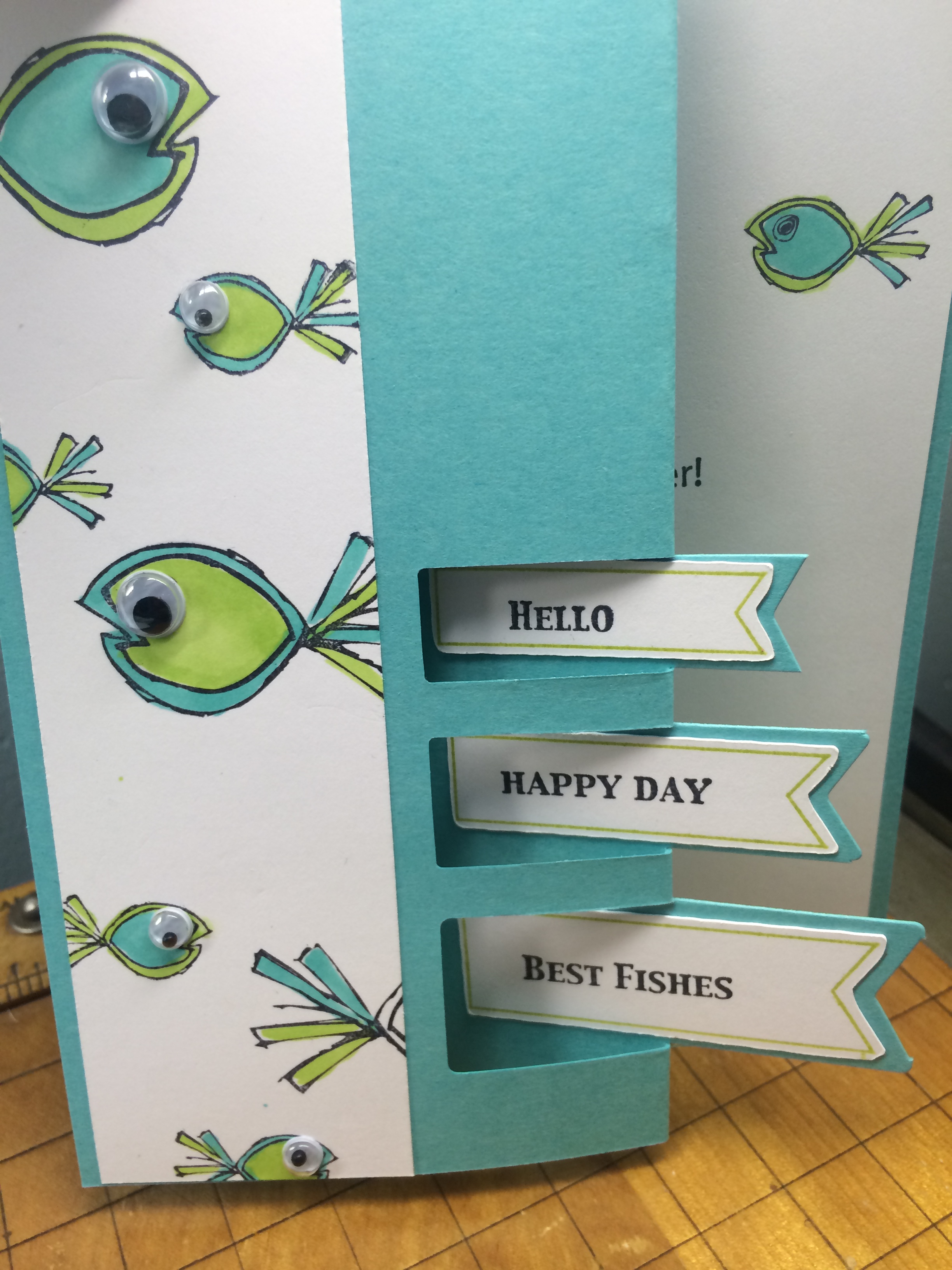 Loving this fish card. I did make the mistake of stamping my words to close to the right side so they show on the front. Live and Learn! This fish card is another card that has been added to our MNT (make n takes) in the booth. Have a great hump day!