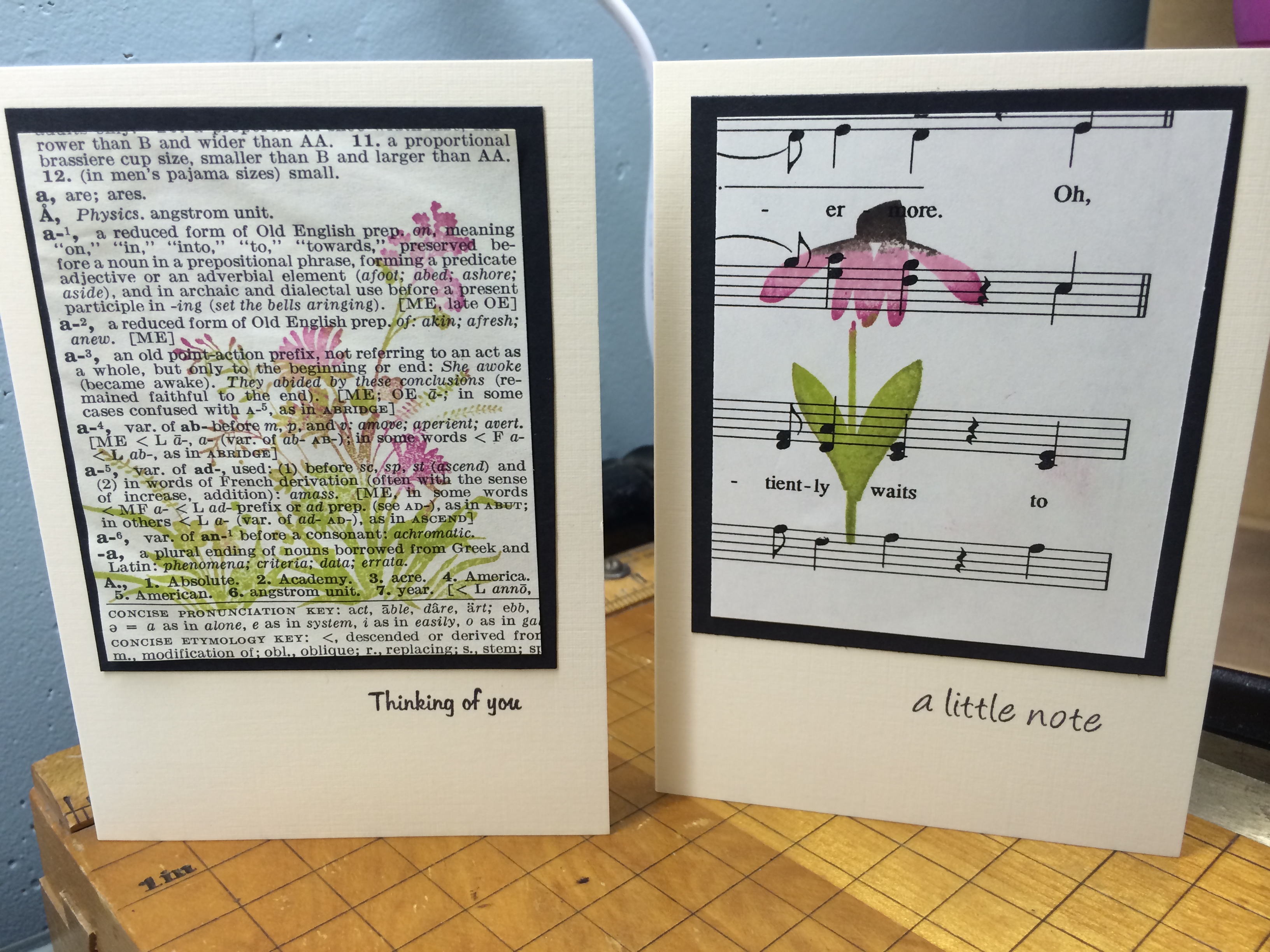 Here is a new MNT for us! I made it a two pack of 3.5″x5.0″ cards using both used music and dictionary paper! How fun!