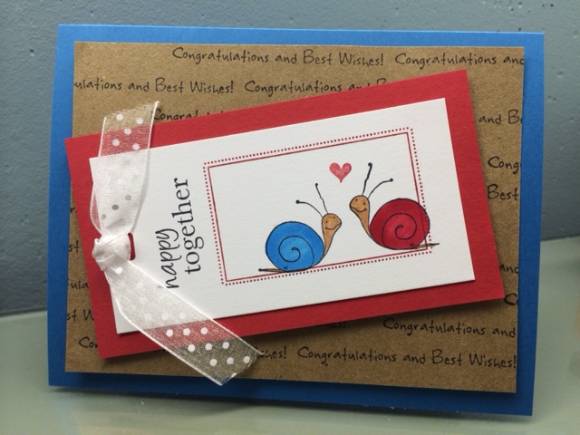 Once again we are home and the fun starts all over again! We will be in Bloomington, MN this weekend…more information for those interested at http://www.rubberstampevents.com! Posting today is another cute snail card! How adorable is this card? Karissa actually made it so I can’t take the credit for it! She found this really cool ribbon punch in my stash and was using it on all her cards. It is just a simple slot punch but I will have to see if I can find that and put them in the booth.