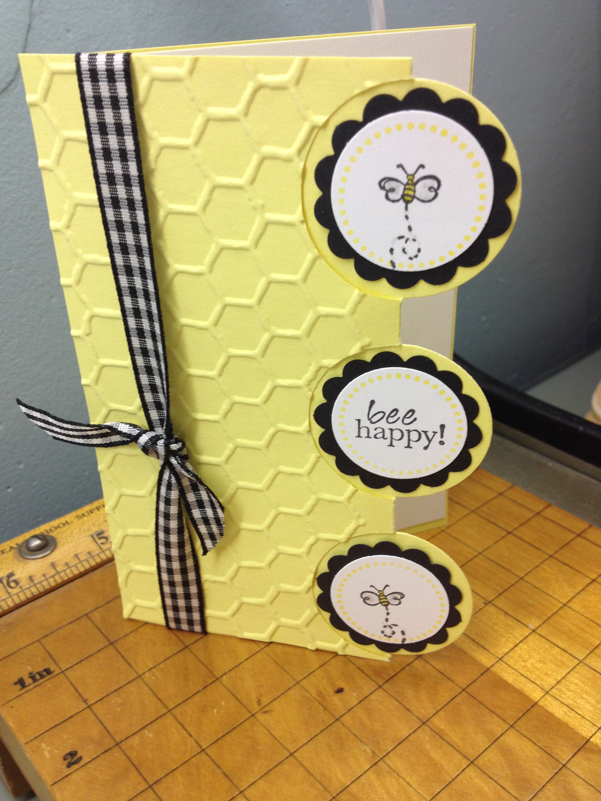Hope you all are happy this Tuesday! This is a 3.5″x5.0″ Triple Circle card that I cut out with my triple circle die. We are hoping to put together a bee card for make n takes this weekend in Bloomington, MN. I’m also looking forward to a day of stamping in my stamp studio tomorrow! Got some ideas floating around in my head that I’ve been wanting to get done.
