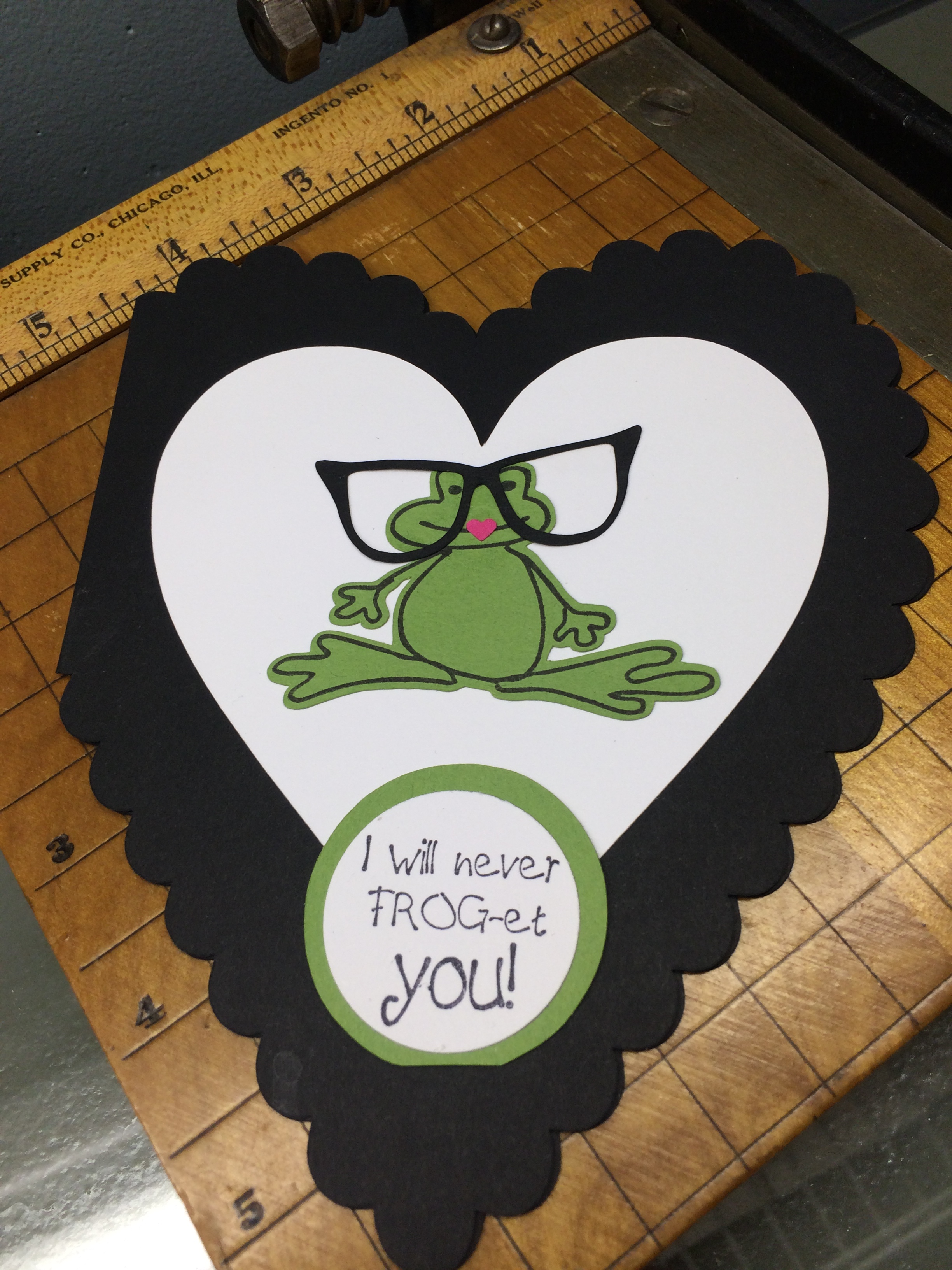 Had a little chance to play in the studio yesterday after we got home and got all the suitcases unpacked. Â I have been wanting to take the svg. files and convert them on the brother website and then cut them out. Â Here is an eyeglass svg. file that I got for free! Â so adorable. Â Should have made it just a bit smaller but I was still happy with it. Â The card is actually a scallop heart card that I also did on the brother website. Â Working on the big computer screen is easier than the little screen on the machine and then I just download it to the usb port and take it to the machine and there it is! Â Love it! Â Today I’m going to try and cut some felt that Amy sent me. Â Have to get a few orders out this morning first!