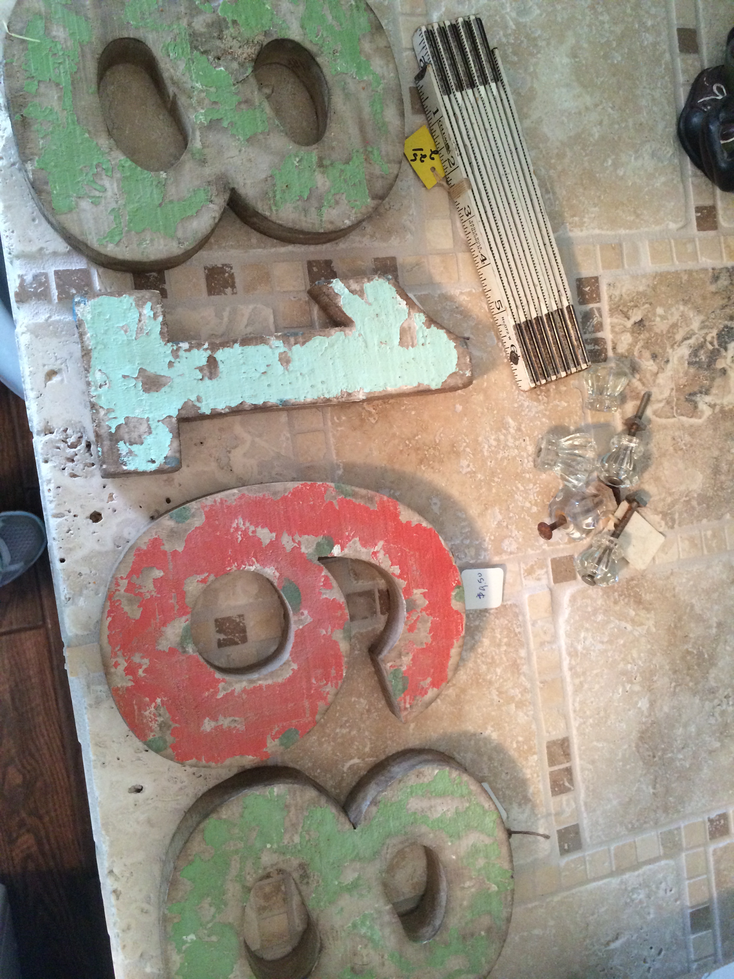 here are a few of my treasures from the weekend. Some really cool house letters, a wooden ruler (that I have no idea what I’m going to do with but it’s cool!) and some glass knobs.