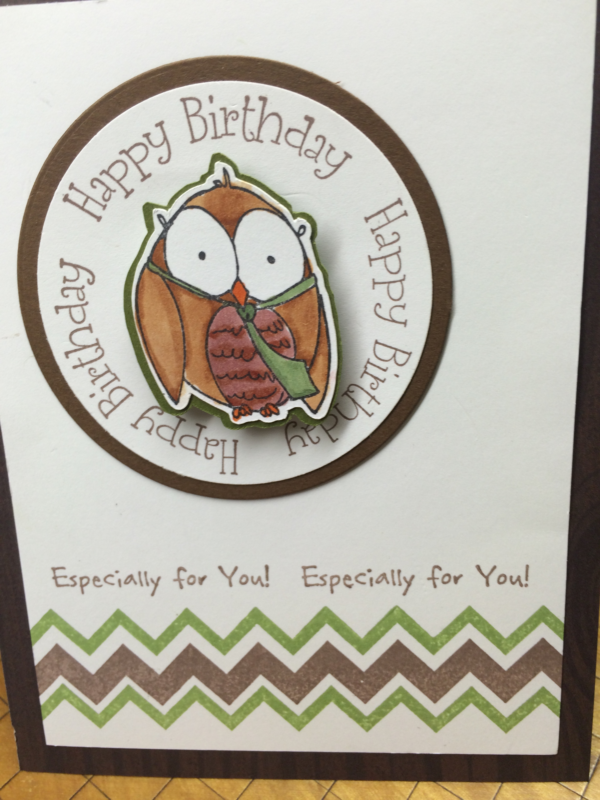 This morning brings a birthday card with our father owl. Stamps Used: DD58 Owl w/ Tie; G265 Happy Birthday Mega Circle; G328 Esp. for You Border; JJ17 & HH31 Chevron borders; E270 Happy and Wonderful Birthday Wishes.
