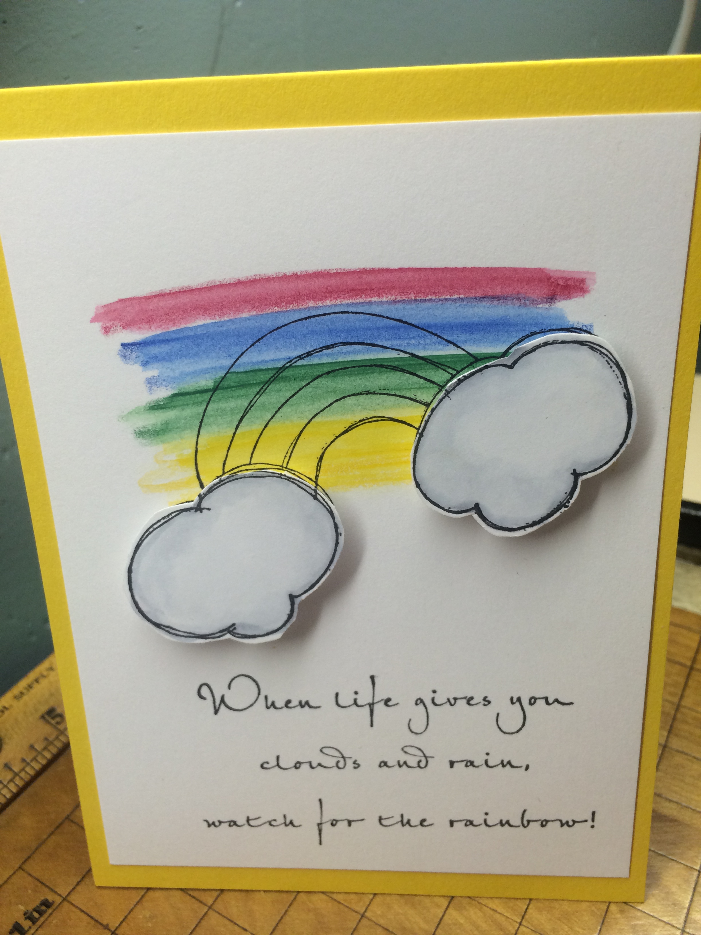 This week’s cards all have been watercolored with stripes in the background for a quick easy card. Stamps Used: G275 Life gives Clouds, H114 KB’s rainbow Lg
