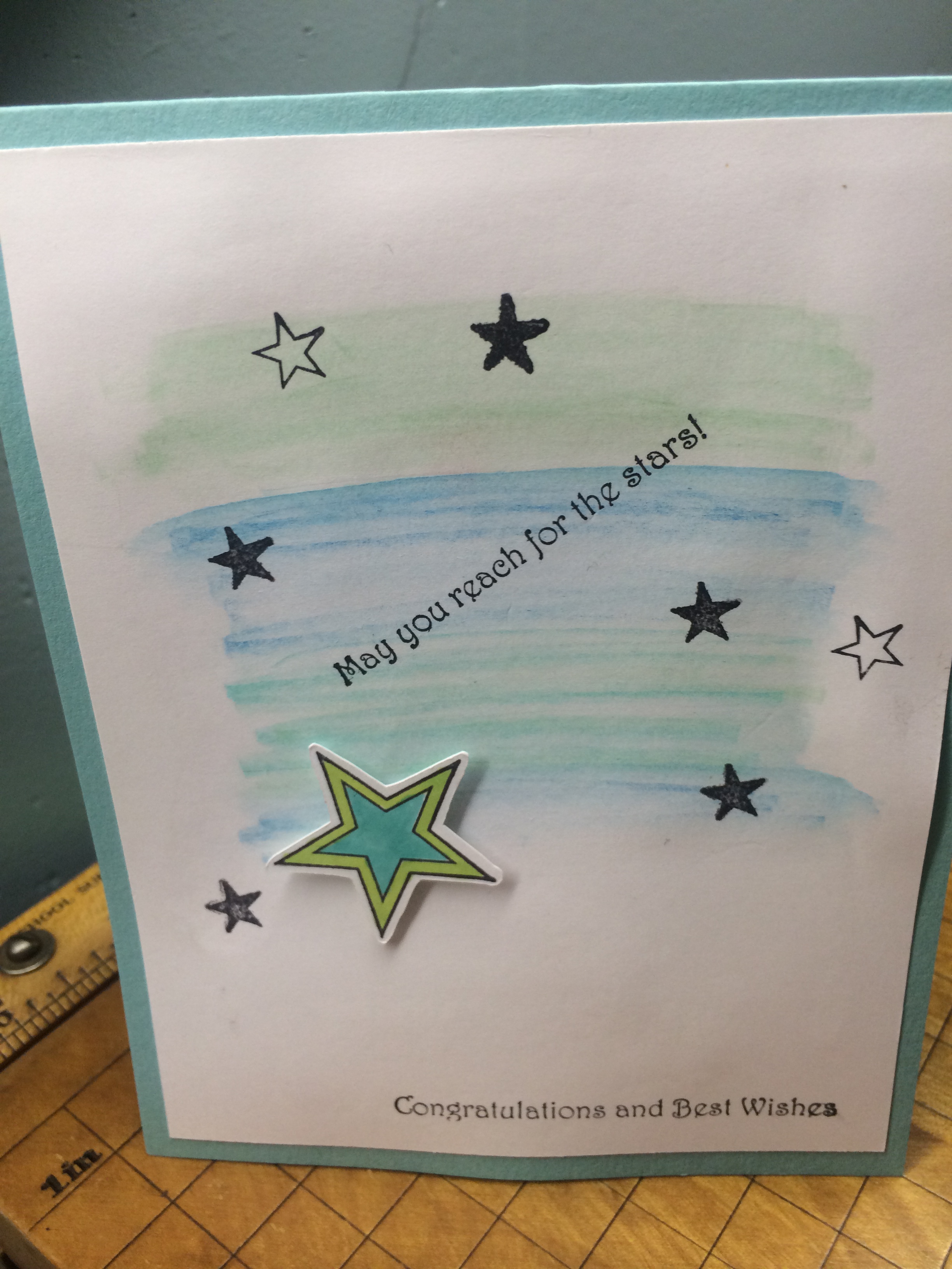 Another background swipe for this card.  Stamps Used:  EE17 Dual Stars lg, AA18 Dual Stars Sm, B177 Reach for stars, D186 Congrats and Best Wishes