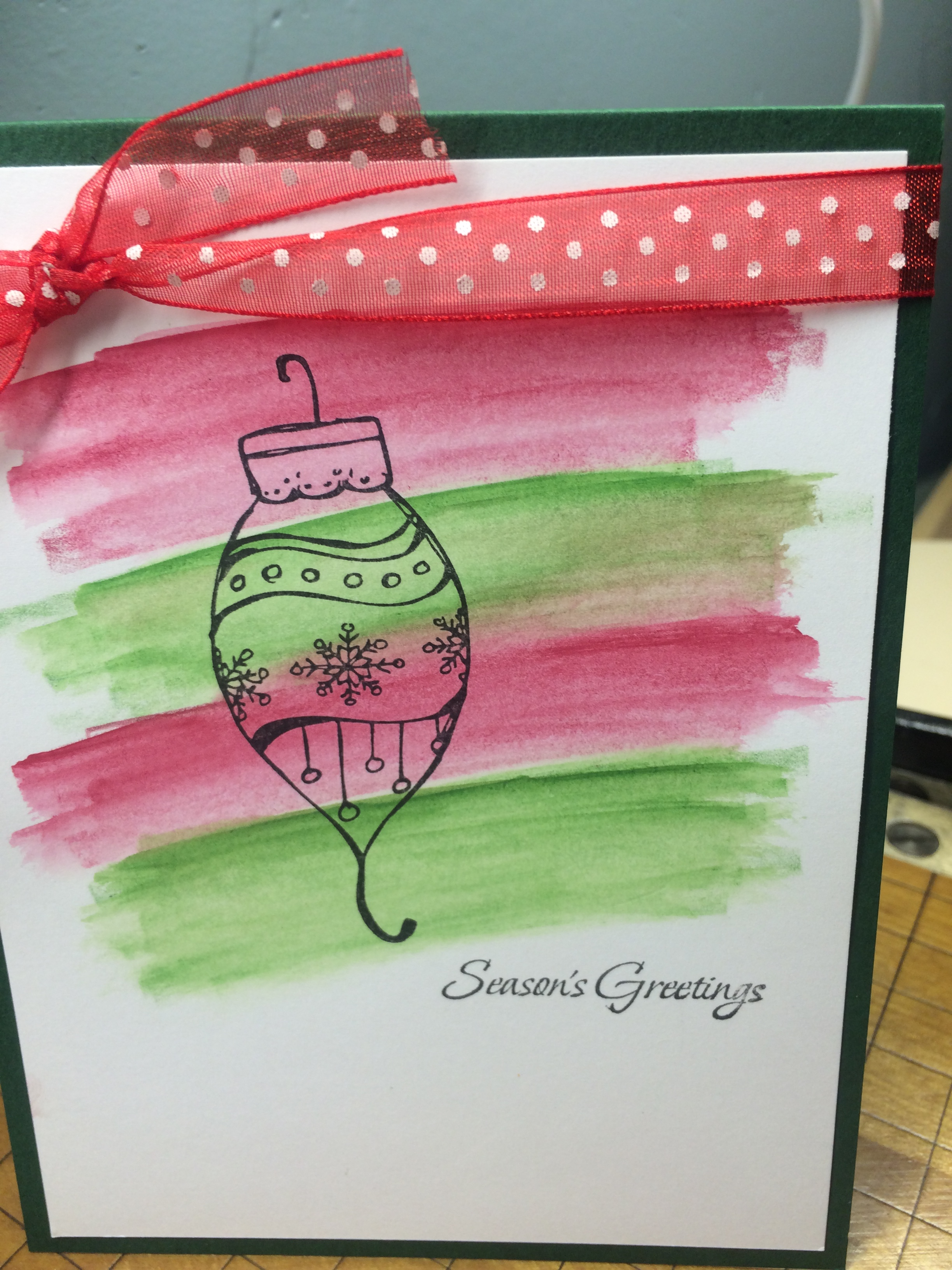 We have been using water color pencils to mark the paper and then our aqua pens to blend the background. I just stamped with black over it (after it dries!) for this simple Christmas card.