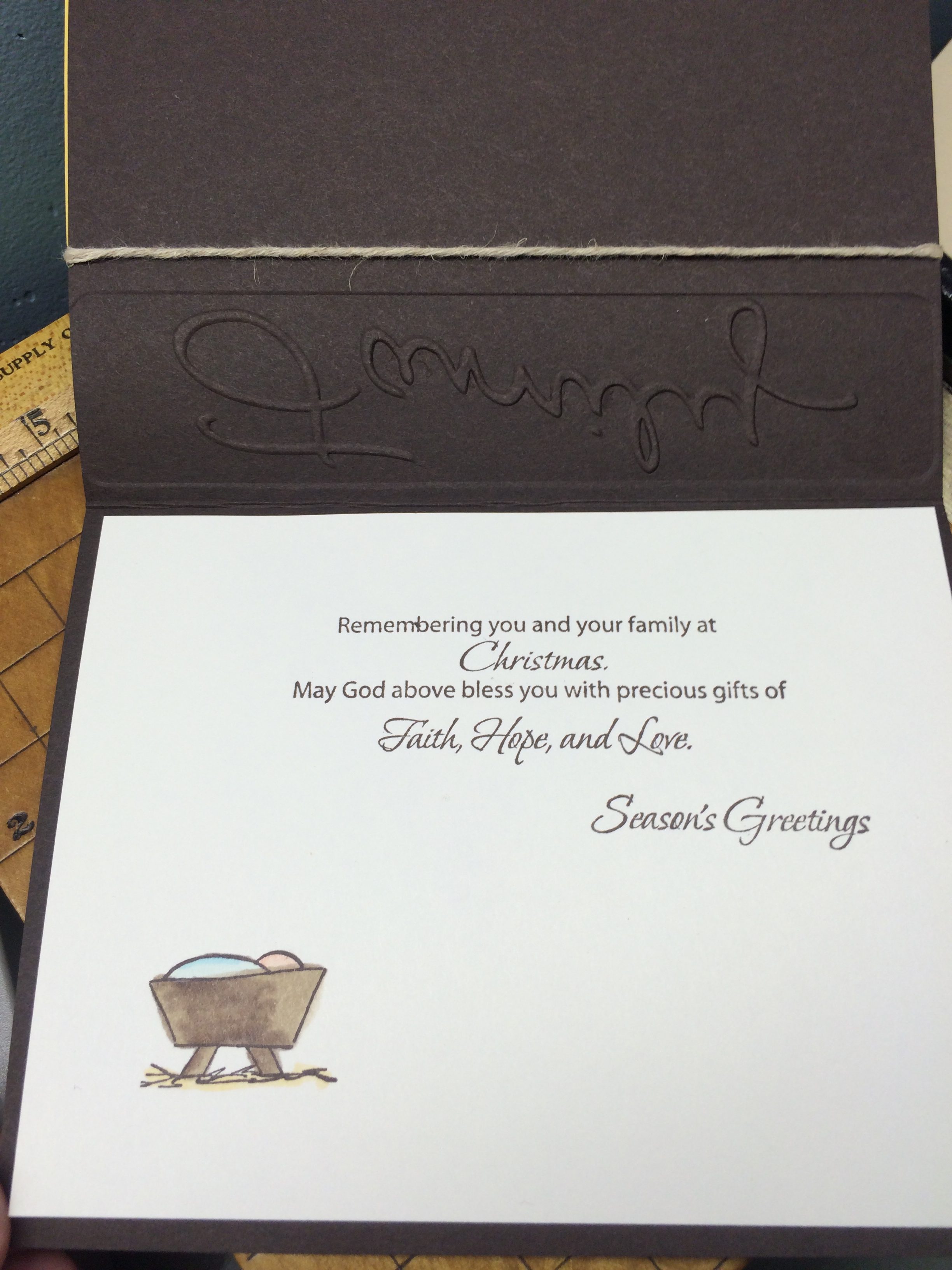 KB’s Manger stamp has been one of my favorites and it continues to be. Such a simple card with lots of meaning. I like that the embossing folder says family and then the words on the inside of the card refer to family. Stamps Used: C181 KB’s Manger Sm, C182 Seasons Greetings, D274 Adore him, E205 KB’s Manger Lg, F199 Family @ Christmas.
