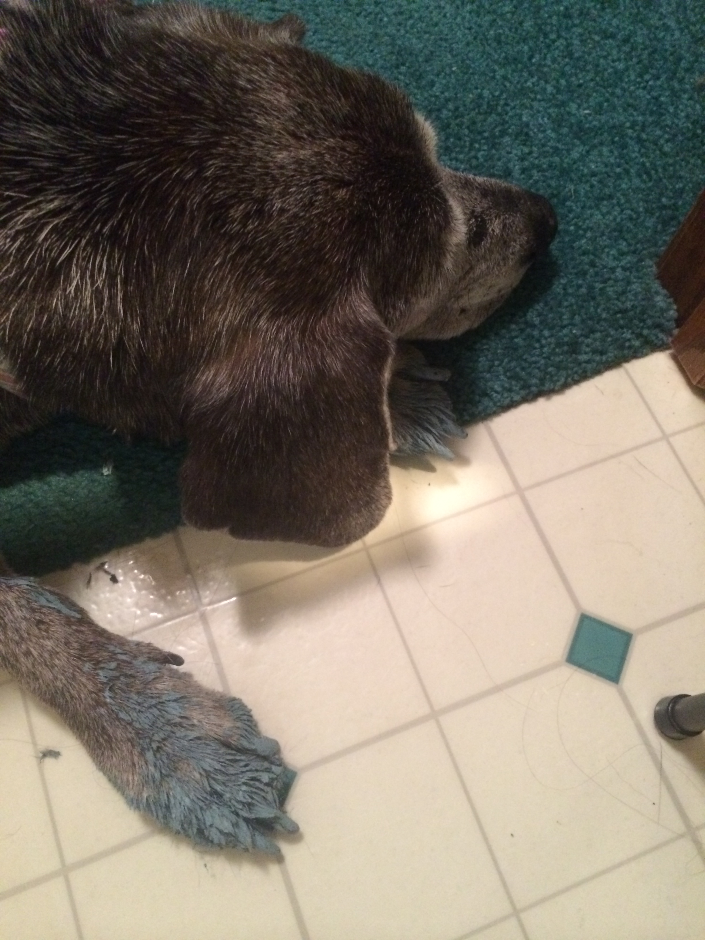 So we had a little trouble with our lovely dog this morning…well it really began in the middle of the night. Our dog who is actually going to turn 20 soon or already is…anyway she’s very, very OLD! She was very restless last night so Kevin put her in the garage but he forgot that he didn’t put the paint away and so we now have a mess!