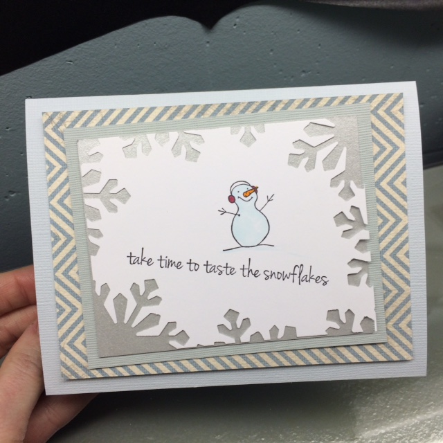 Stamps for today’s Card: CC64 KB’s Ear M off Snowman Sm, E260 Taste Snowflakes. How cool is the way Karissa used this snowflake punch!??