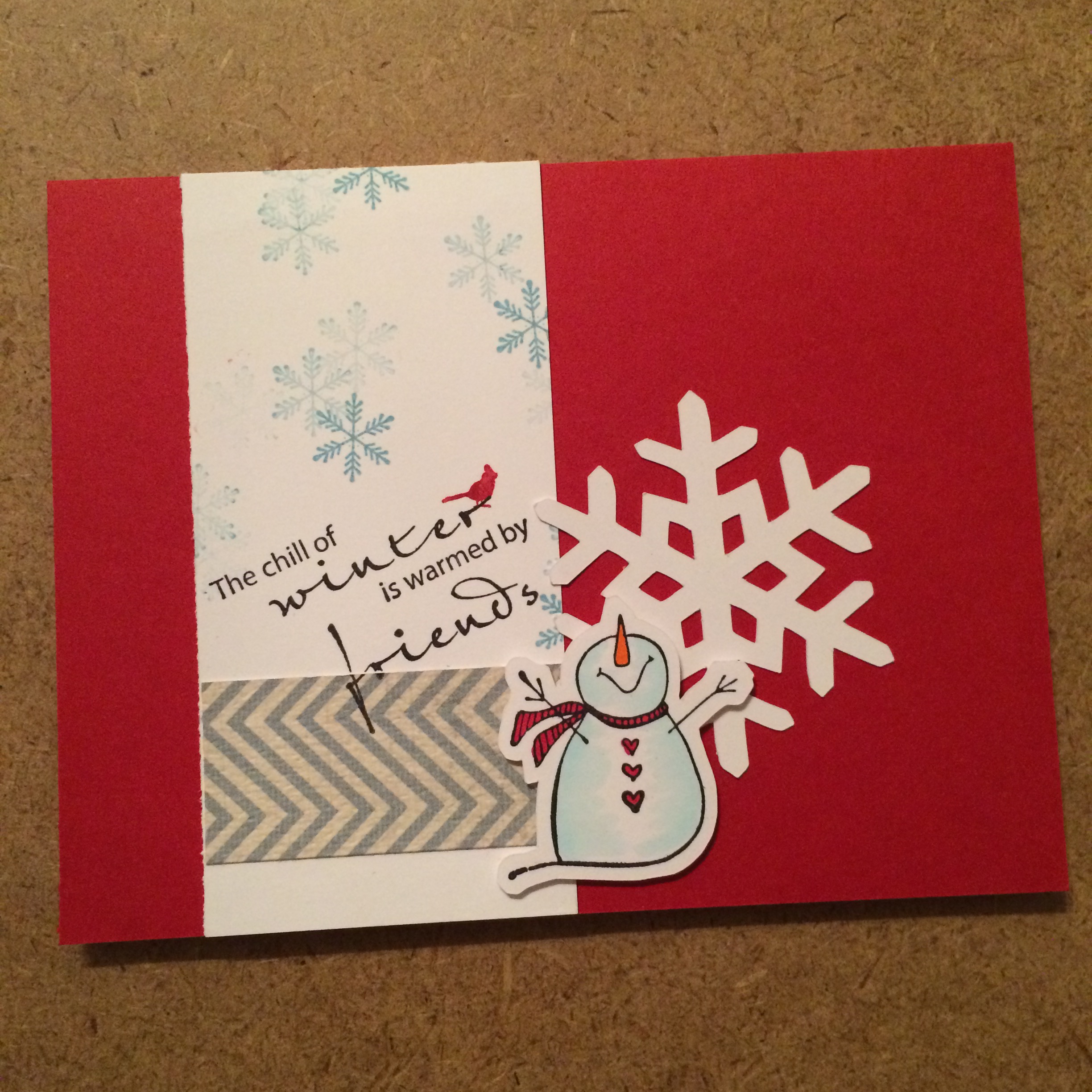 Stamps Used: A240 KB’s Arrow Snowflake, BB57 KB’s Cardinal sm, D259 Chill of Winter, EE42 KB’s Heart Button Snowman, med. The snowflake is a pattern from the Brother Scan N Cut !