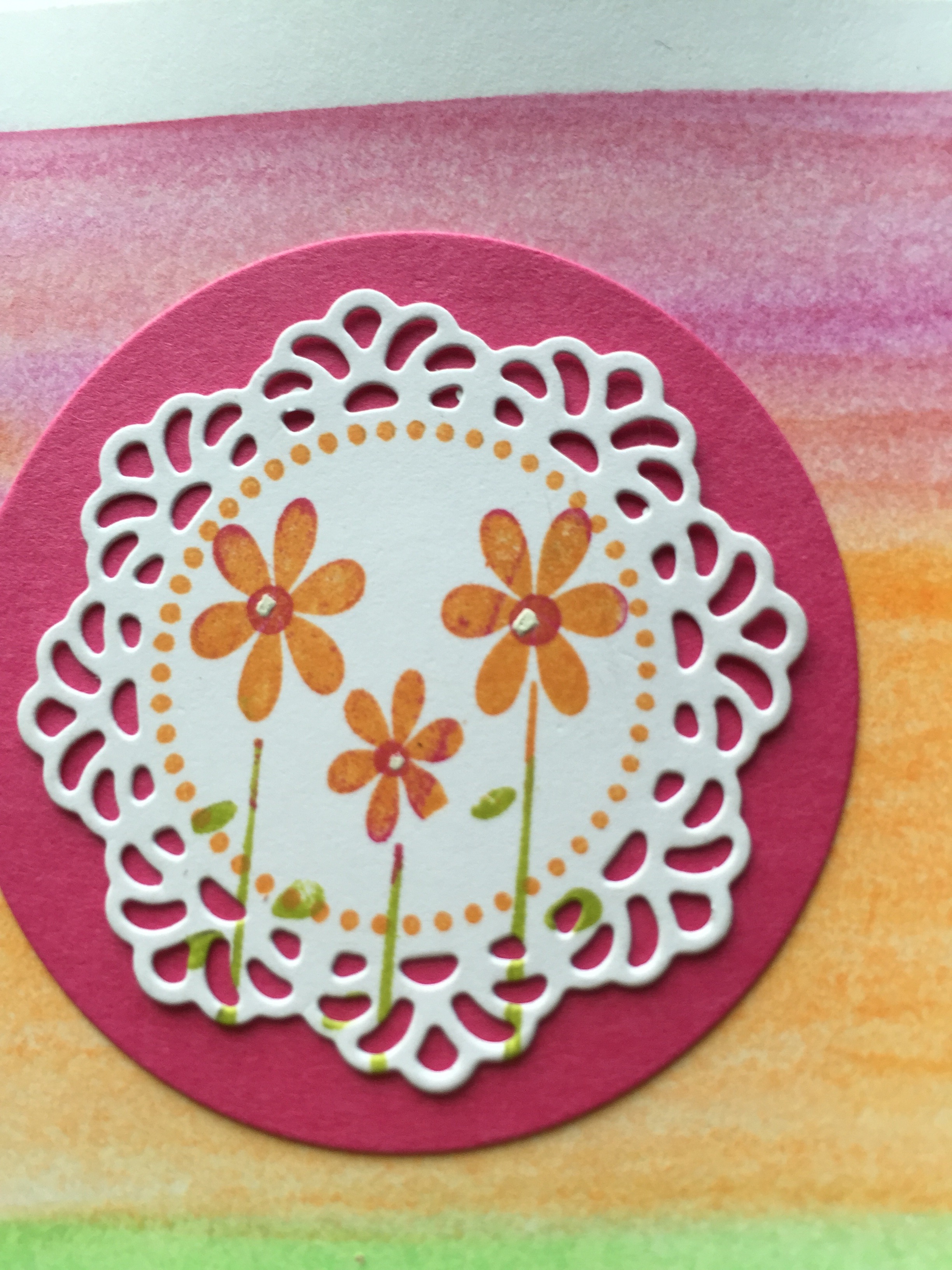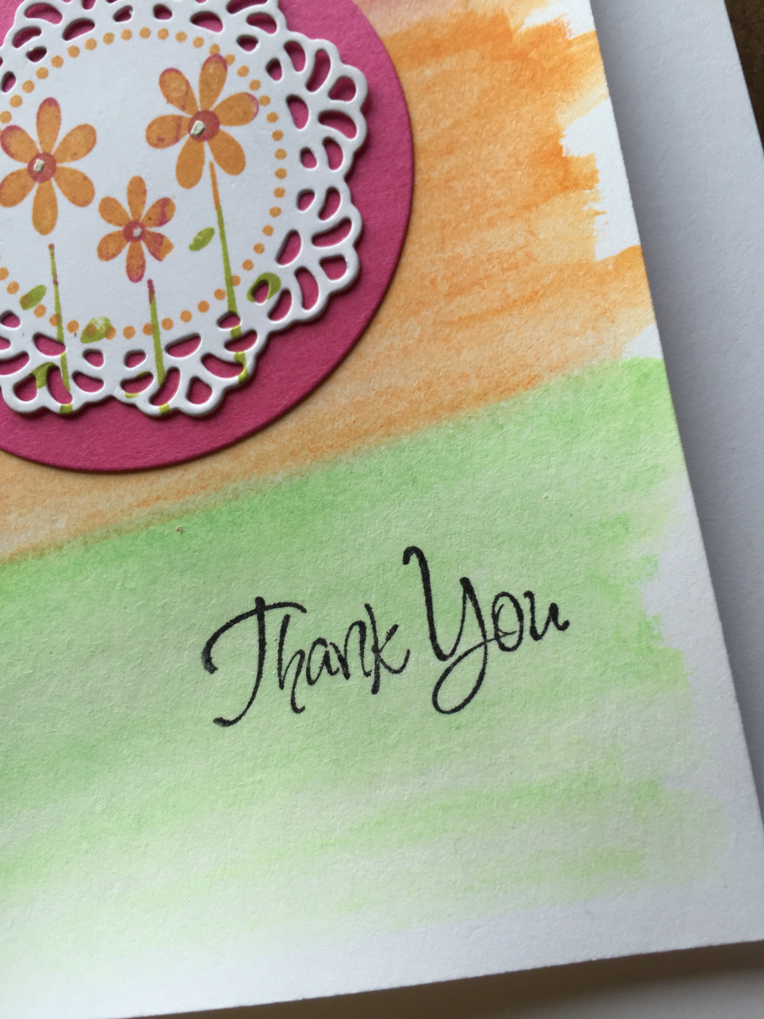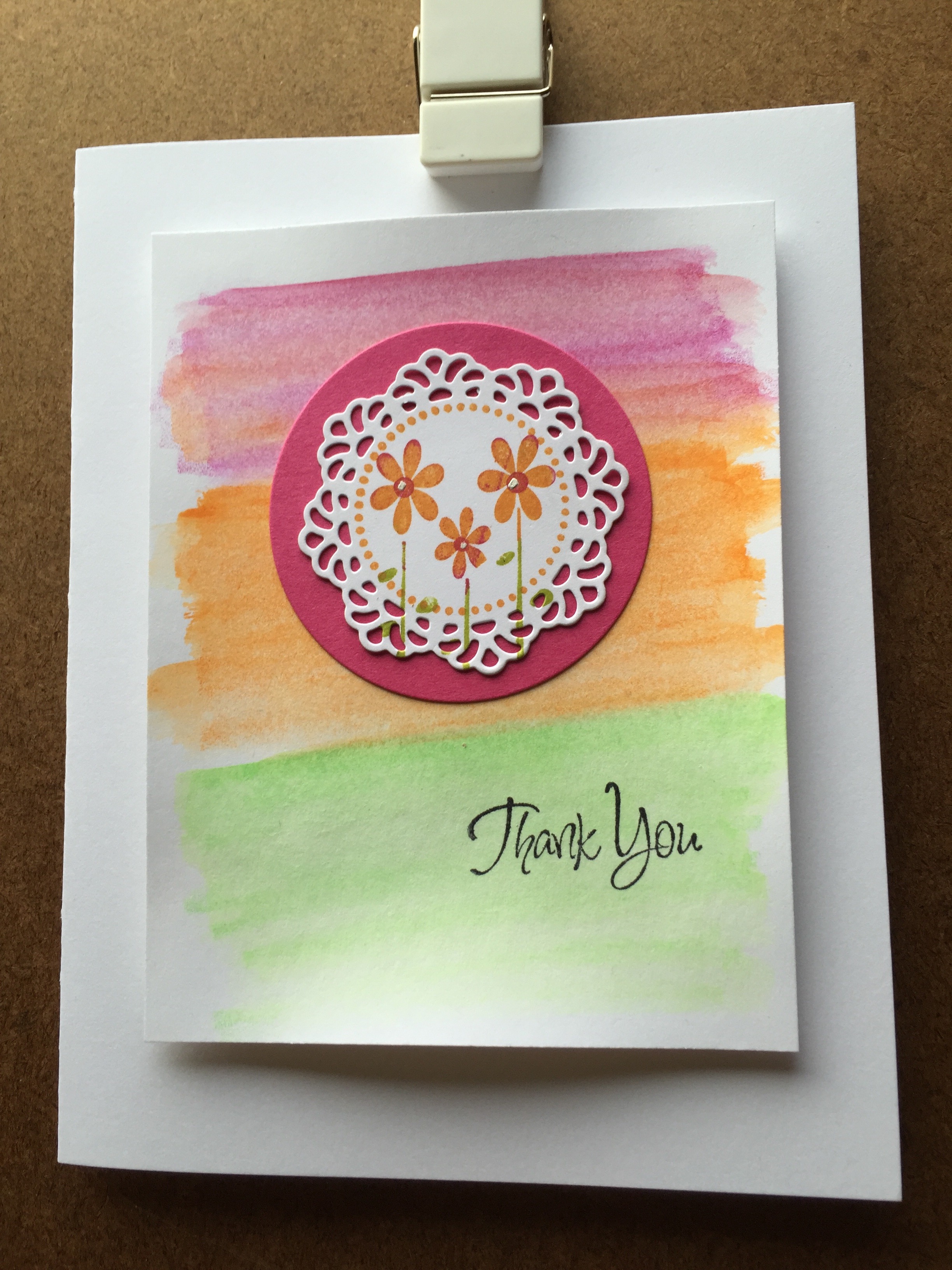 Good Morning! Here is the thank you card that I made yesterday. I used water color paper for the swatch with pink, orange, & green. I love these mini doily circle cutting dies from Die-namics.