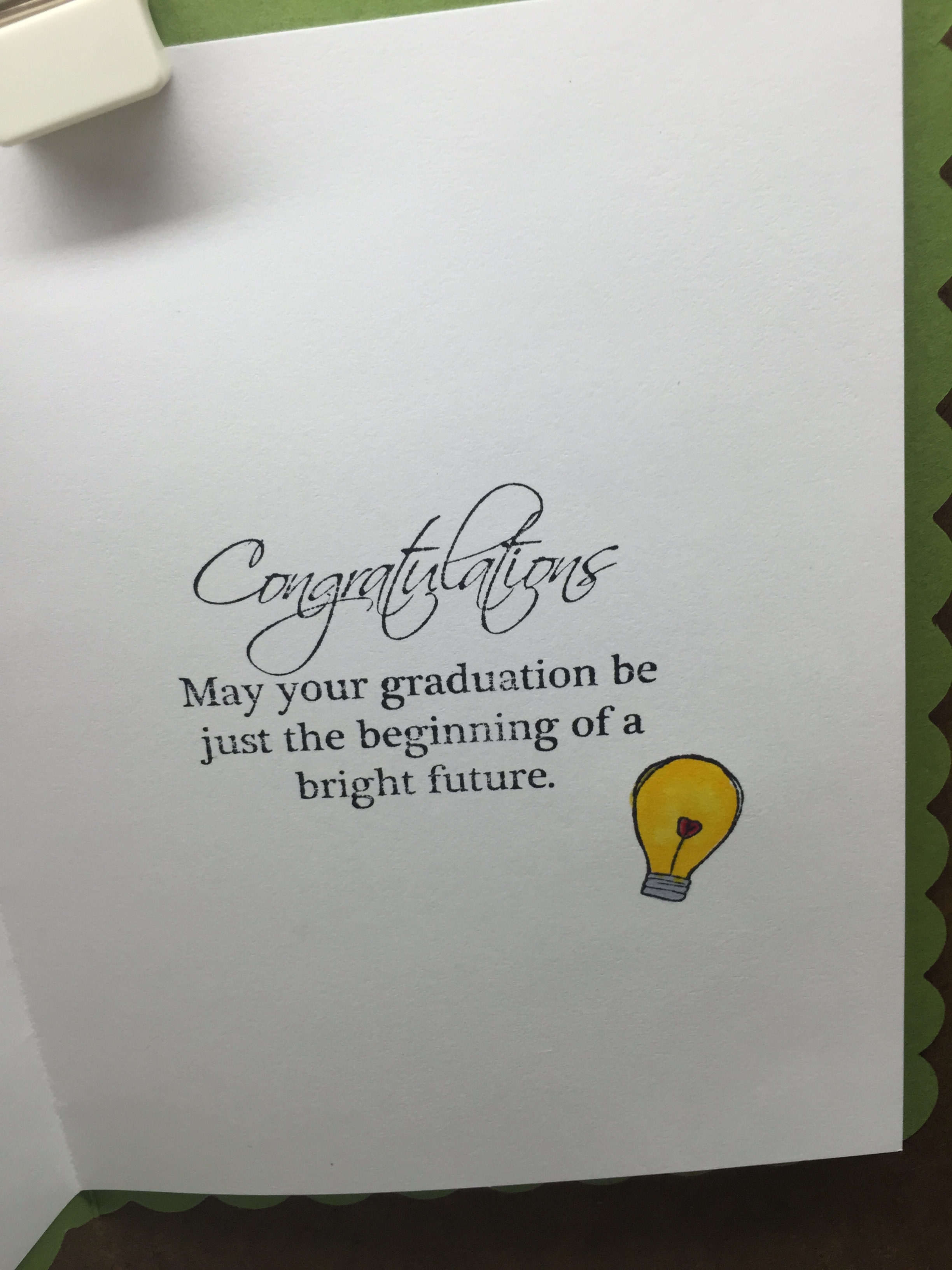 Austin Graduation Graduation Good Evening! Here’s the card I made for my nephew’s graduation. We are actually leaving tomorrow now so lots to do to get everything ready 🙂 Stamps Used: G337 KB’s Lightbulb Lg, D187 KB’s Grad Cap, E279 Congrats Bright Future, D312 Bright Future Share this: Click to share on Pinterest (Opens in new window) Pinterest Click to email a link to a friend (Opens in new window) Email Click to share on Facebook (Opens in new window) Facebook Like Loading...