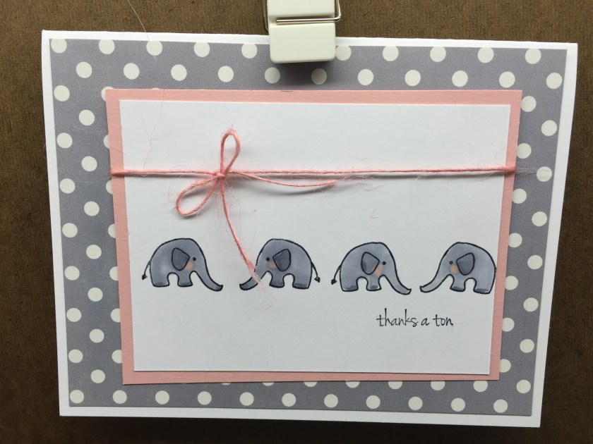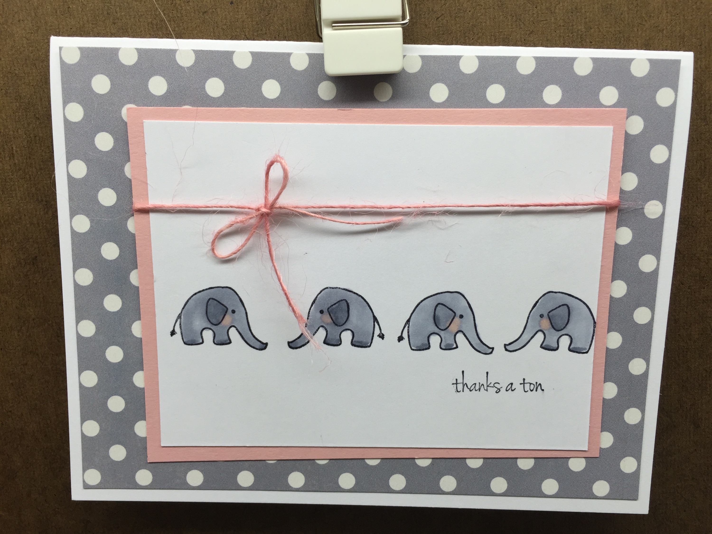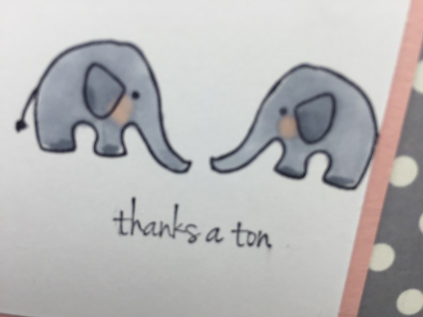 thanks a ton for putting up with our scheduled blogging. The plan is to arrive home today so we can go back to regular blogging.  Stamps Used: A246 thanks a ton (http://shop.endlesscreations.info/A246-thanks-a-ton-A246.htm); CC71 KB’s Baby Elephants Mini (http://shop.endlesscreations.info/CC71-KBs-Baby-Elephant-Mini-CC71.htm)