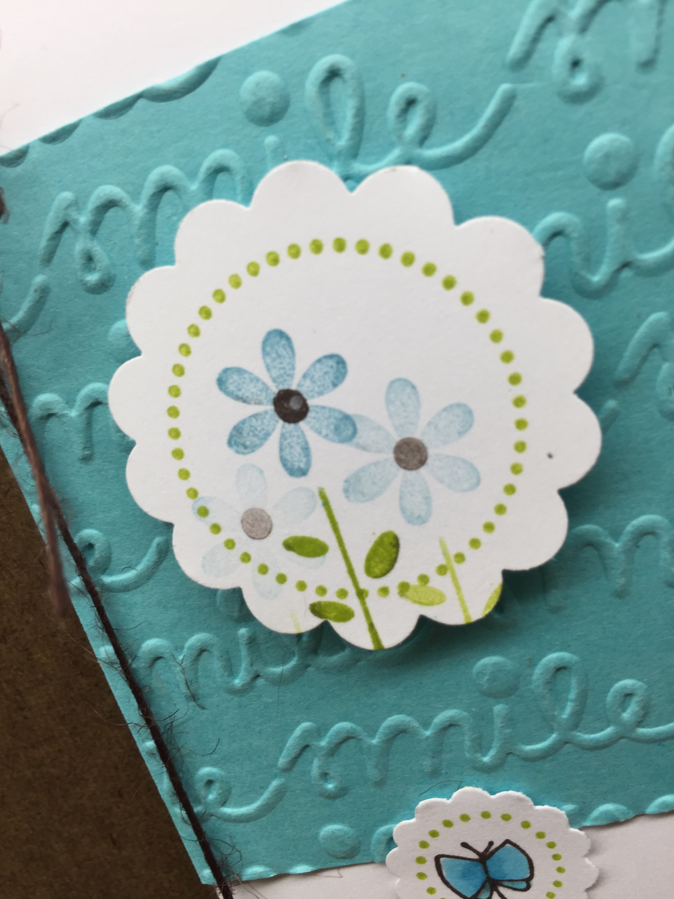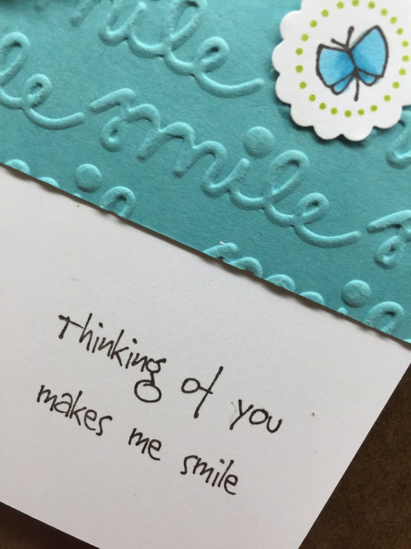 Stamps Used: AA31 KB’s Butterfly mini; AA15 Dual Dots Mini ; A146 Retro Daisy Solid Single; BB39 Dots & Lines; EE25 Dots & Lines; D306 Thinking of You Smile