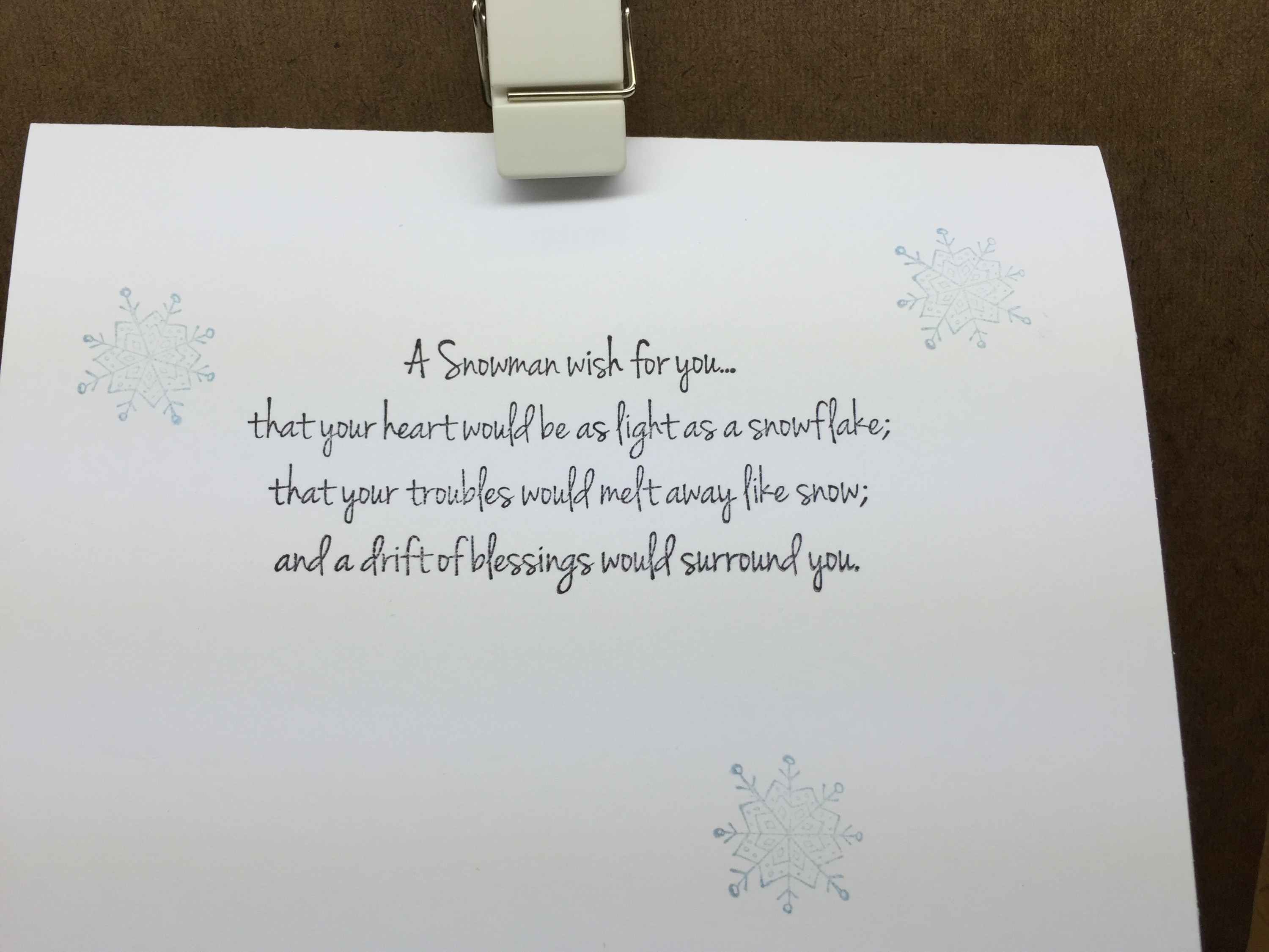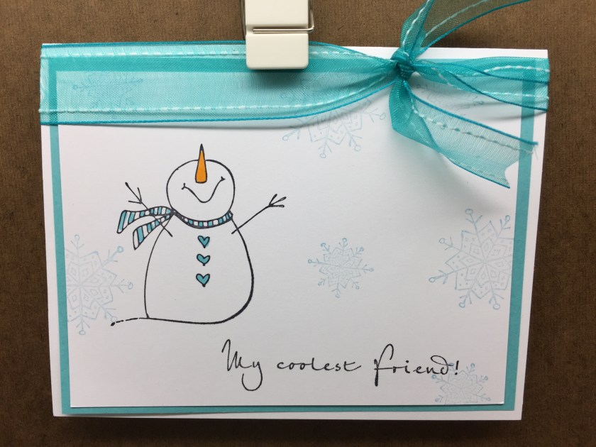 It’s a winter card today ! I needed a quick easy card for a friend and this fits the bill!  Stamps Used:  FF36 KB’s Snowman; F233 A Snowman Wish; E248 My Coolest a Friend; A212 KB’s Snowflake SmallC171 KB’s Snowflake