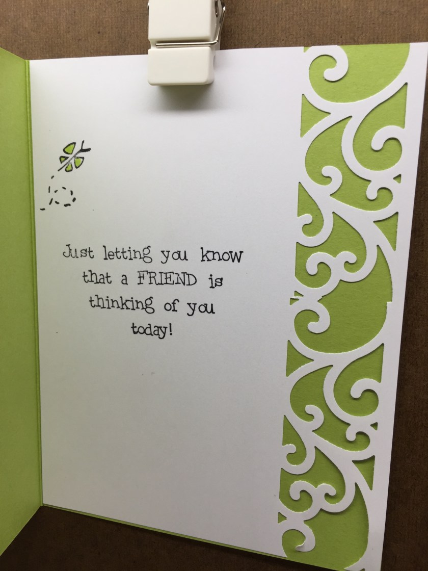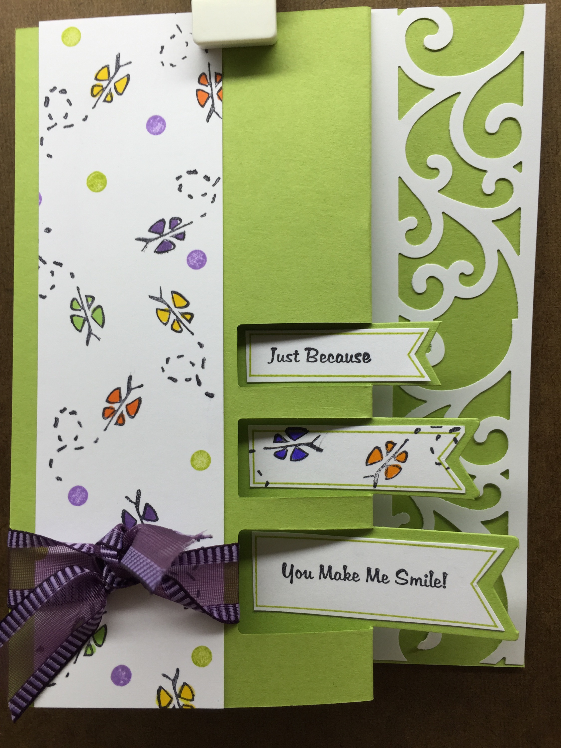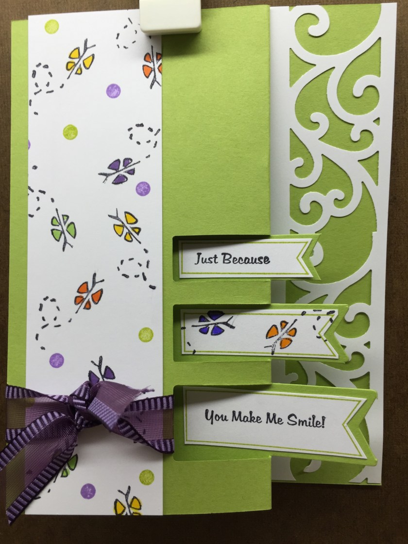 Stamps Used: BB25 KB’s Butterfly; AA15 Dual Dots Mini; E142 A Friend; A123 You make me smile; F235 Triple Flag Banner