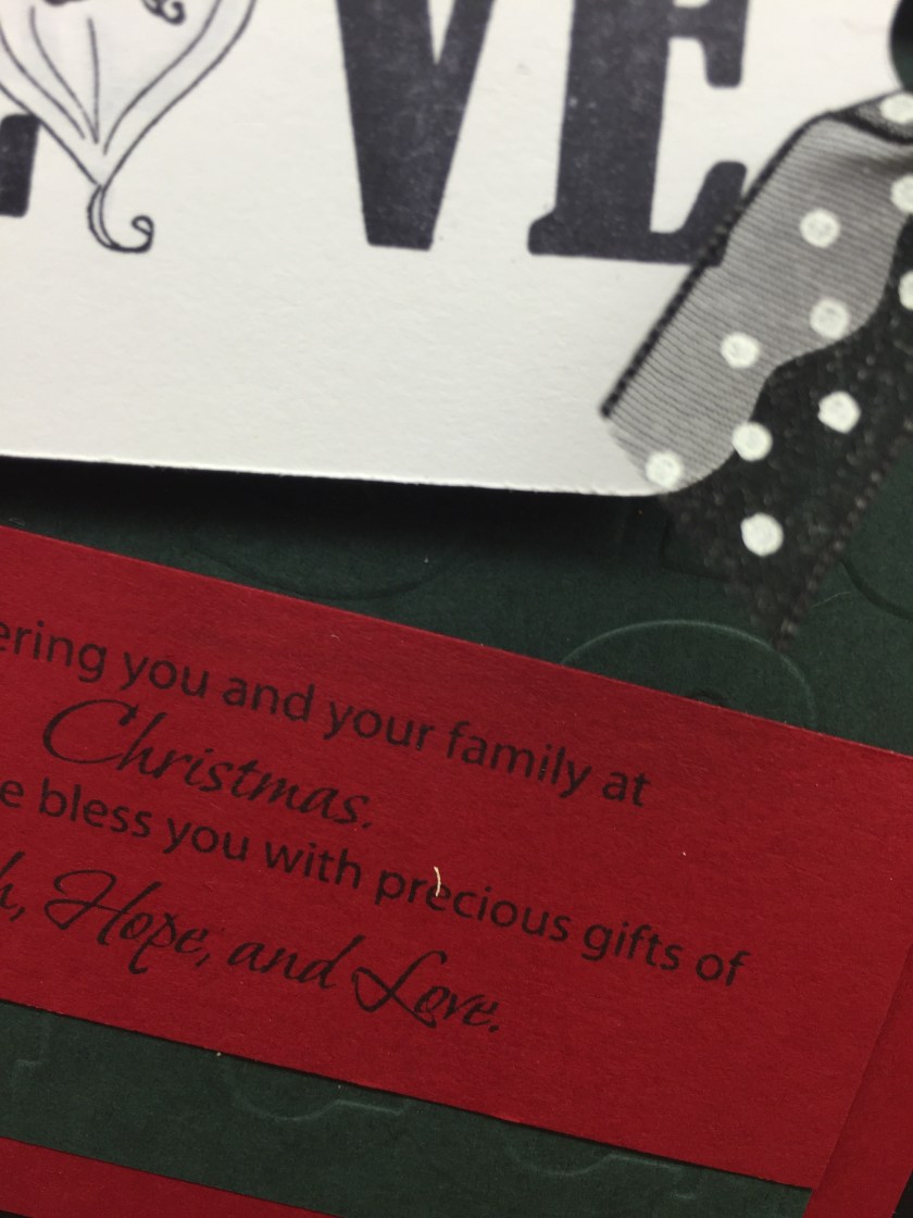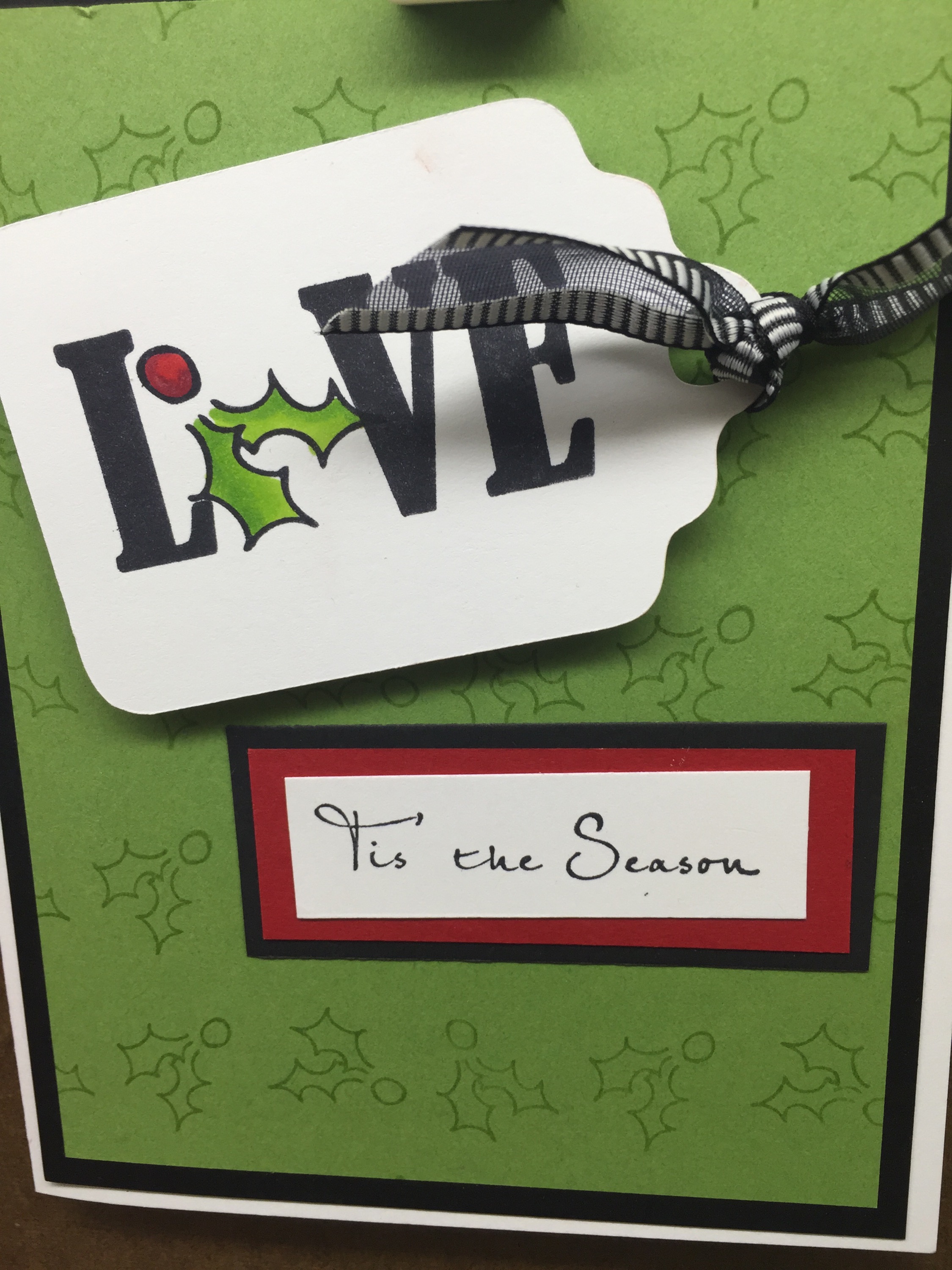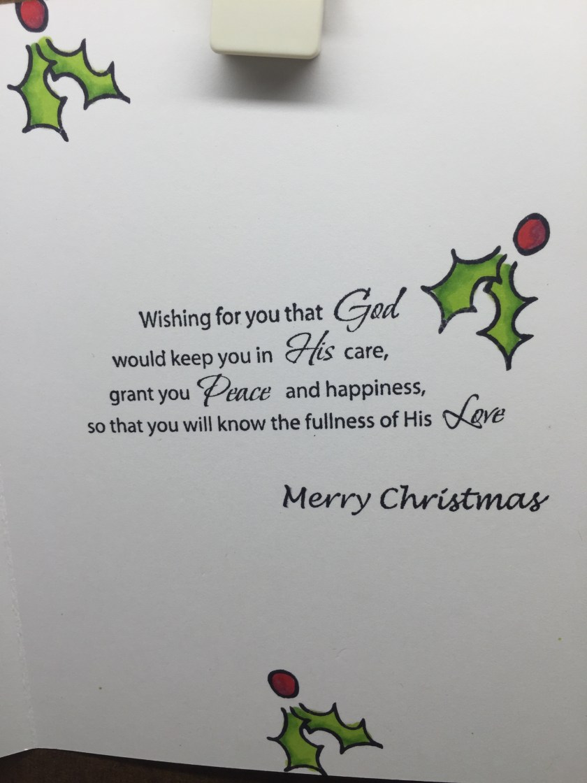 Stamps Used: B143 Merry Christmas; B250 KB’s Single Holly; C219 Tis the Season; E252 Open Love; H122 Holly Border; G290 God His Care