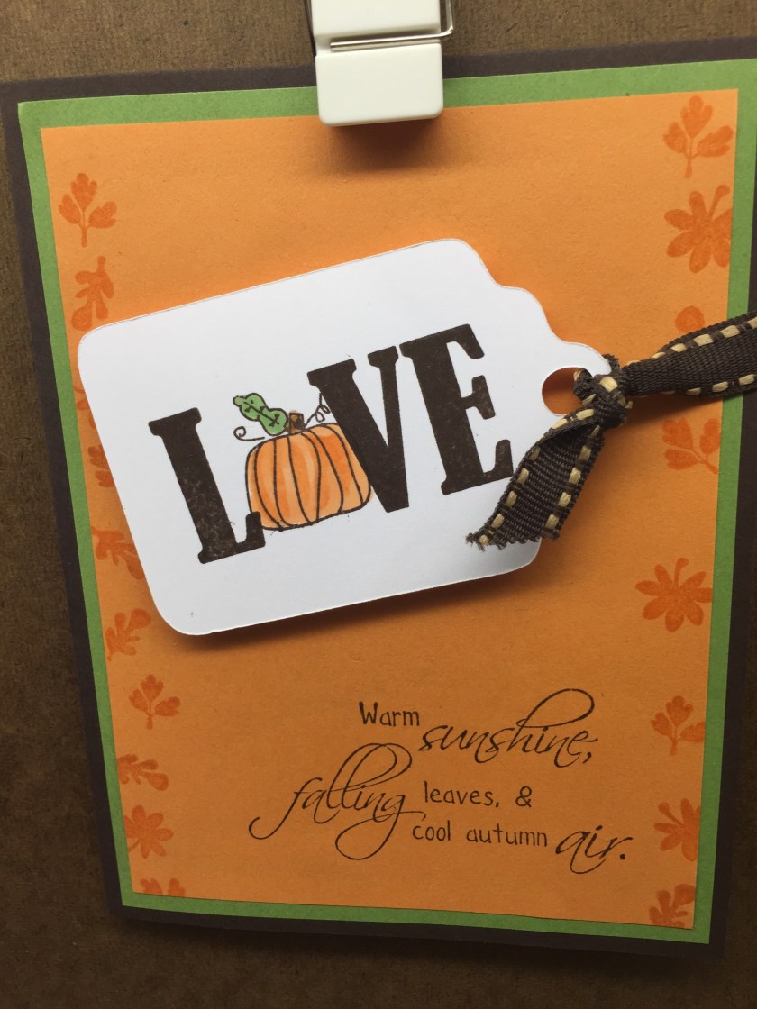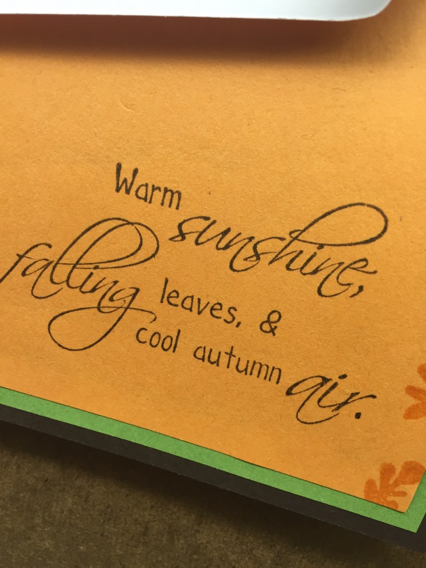 Stamps Used: A208 KB’s Oak Leaf; A209 KB’s Maple Leaf; A210 KB’s Three Leaf; BB29 Sketch Pumpkins Small; E252 Open Love; F178 Warm Sunshine; F179 Beautiful Autumn Season