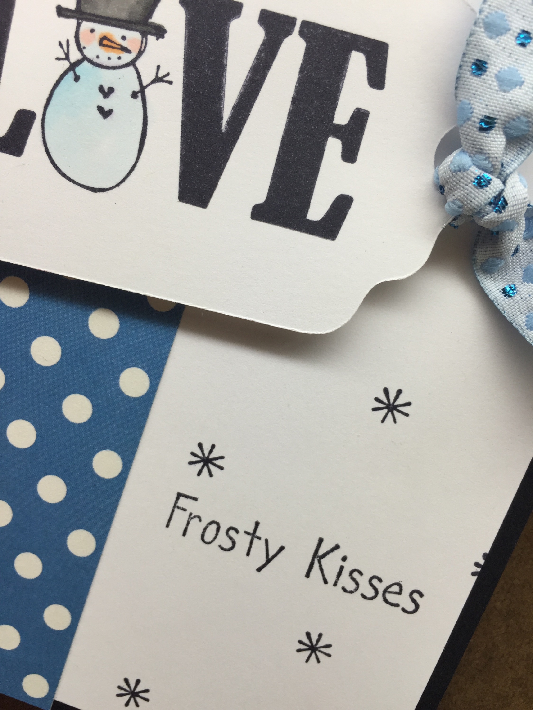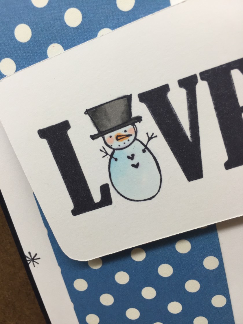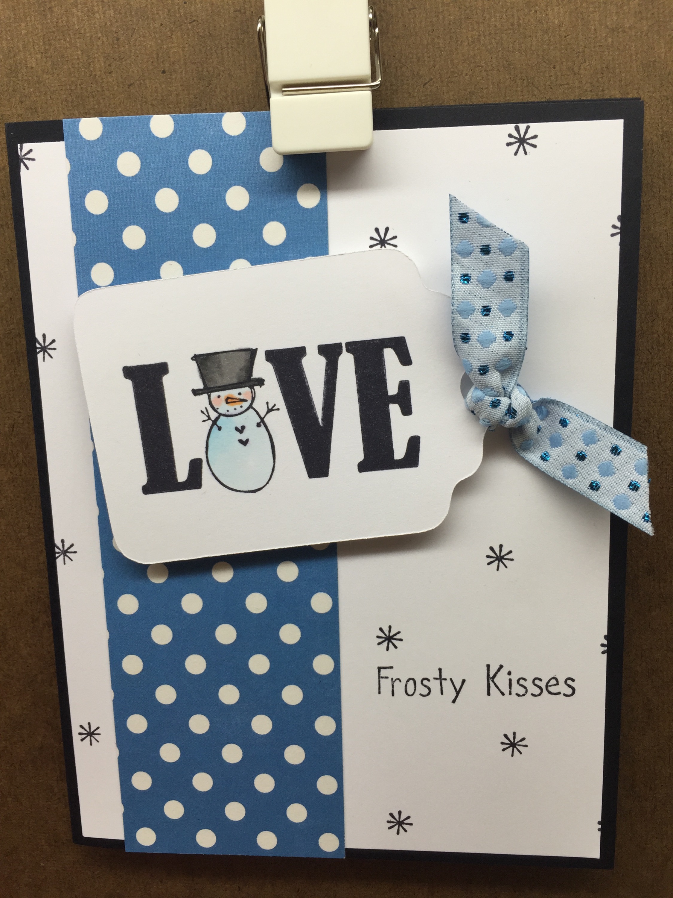 Another Open Love card! Stamps Used: B245 KB’s Tophat Snowman mini ; B261 Frosty Kisses; BB22 Snowflake Fun Cube; E246 If Snowflakes were Kisses; E252 Open Love;