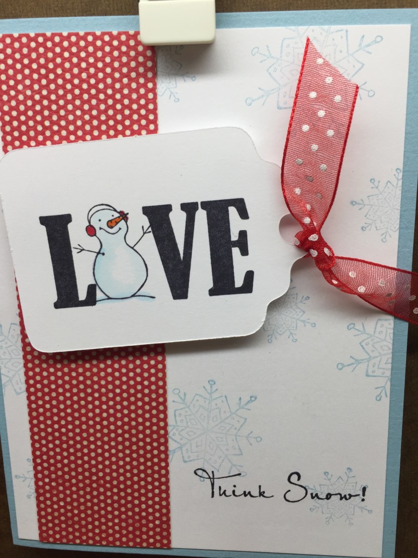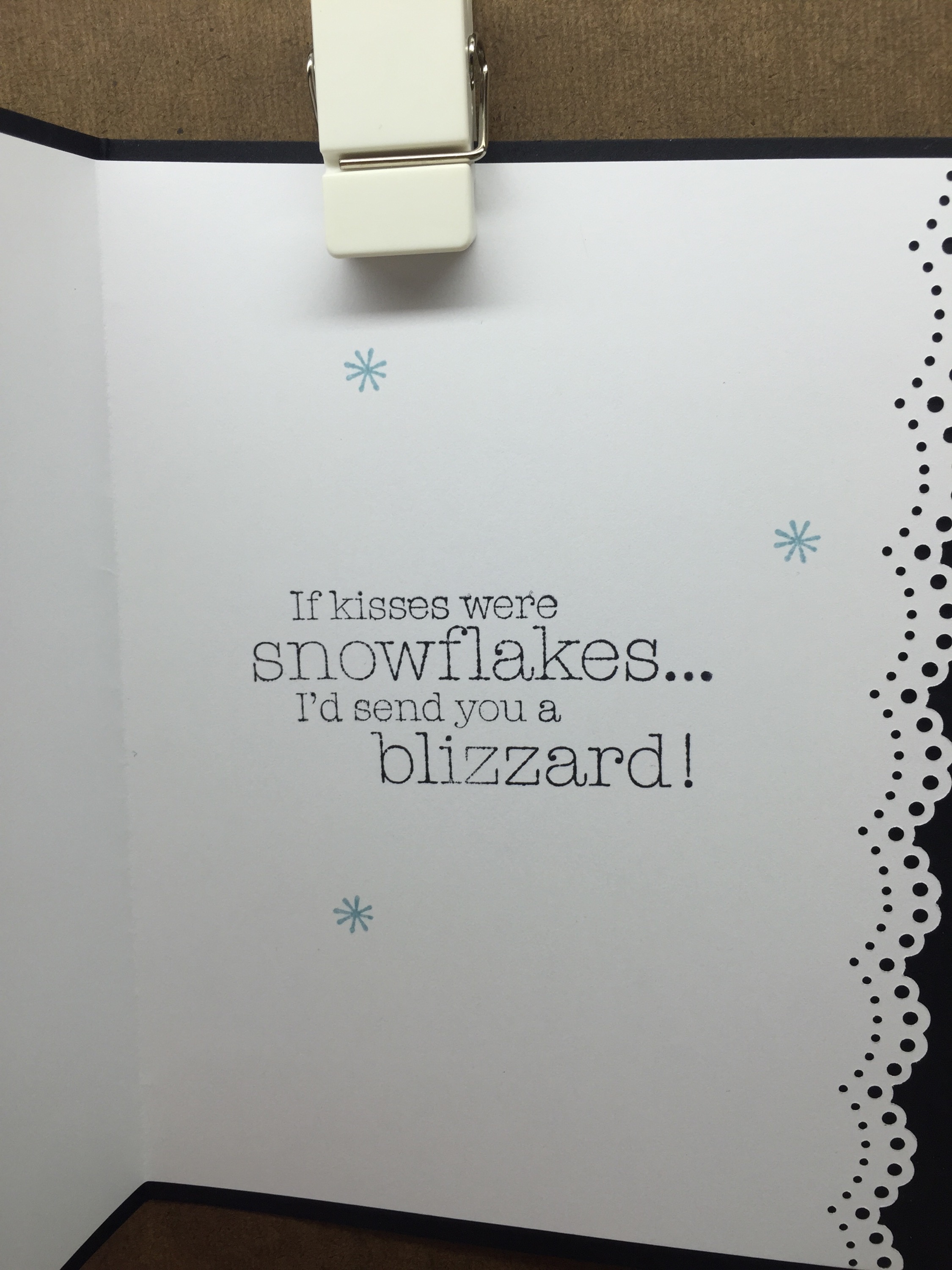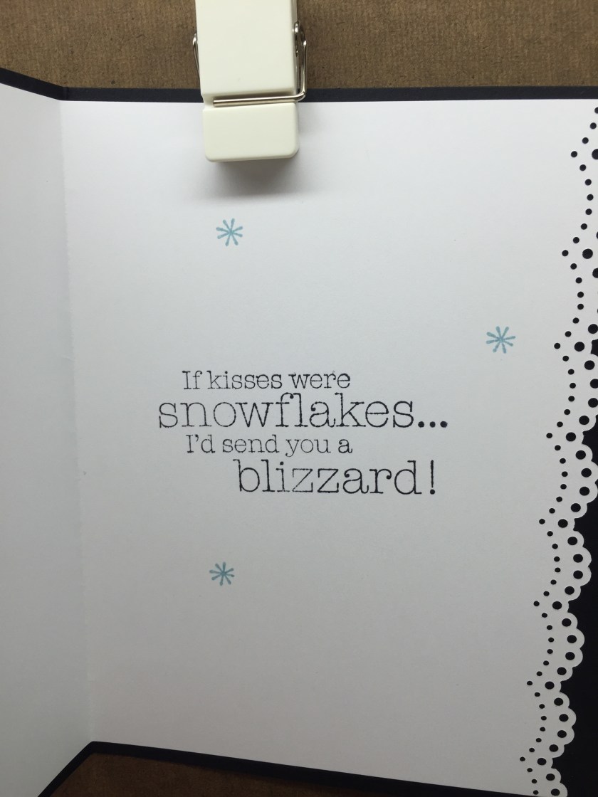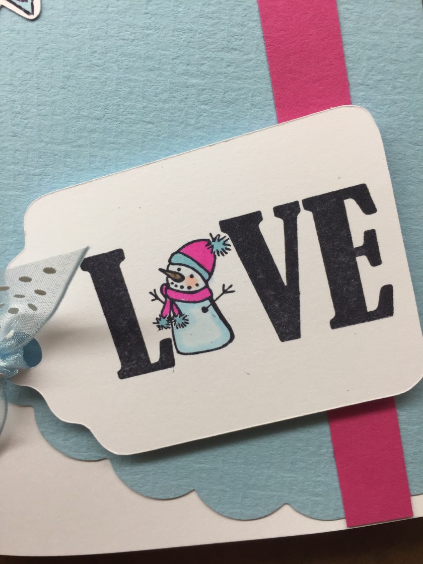 Another Open Love card! Stamps Used: B245 KB’s Tophat Snowman mini ; B261 Frosty Kisses; BB22 Snowflake Fun Cube; E246 If Snowflakes were Kisses; E252 Open Love;
