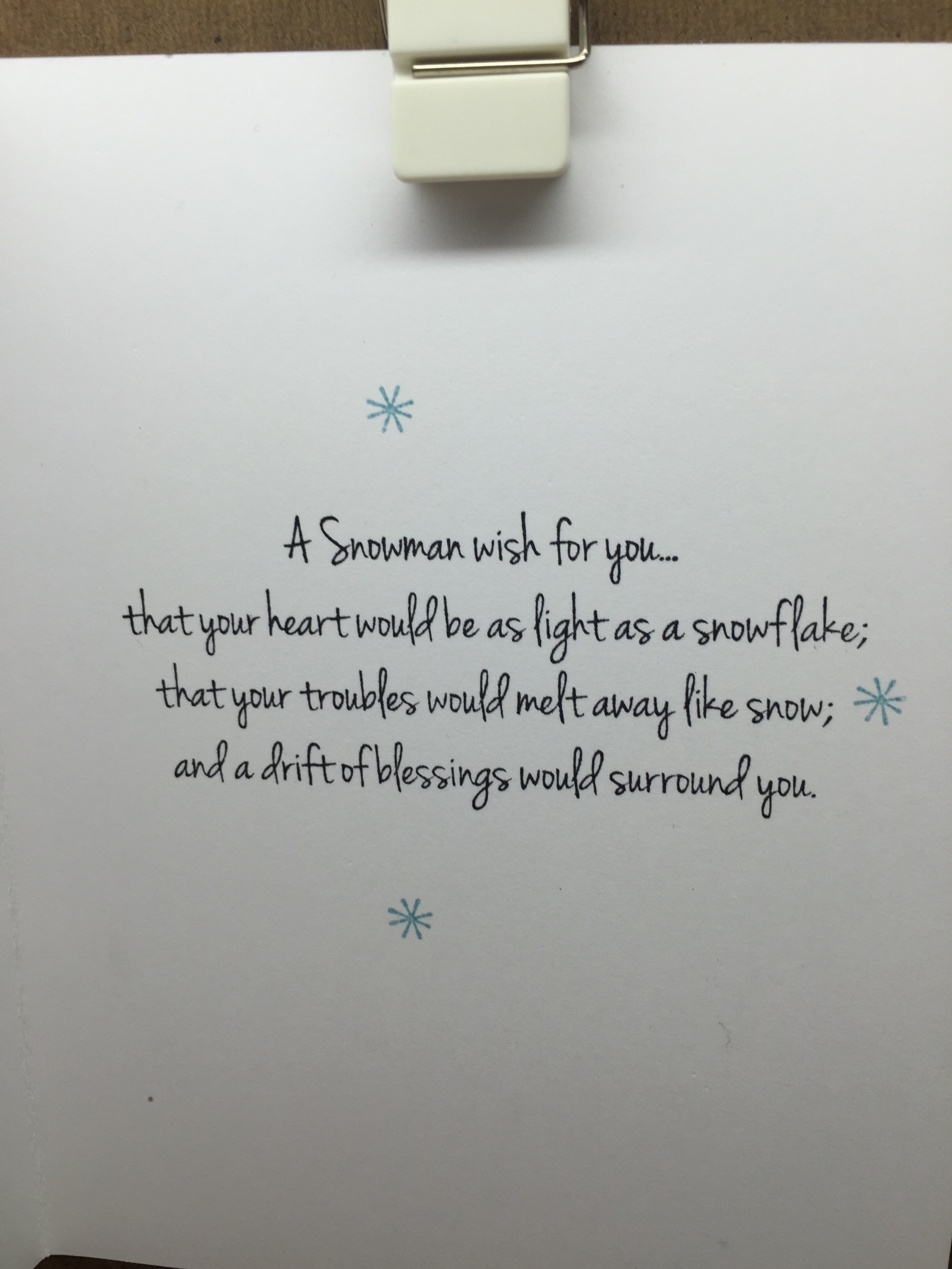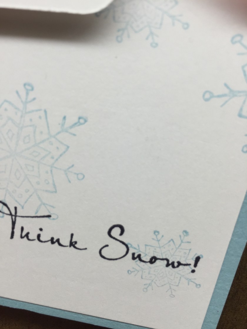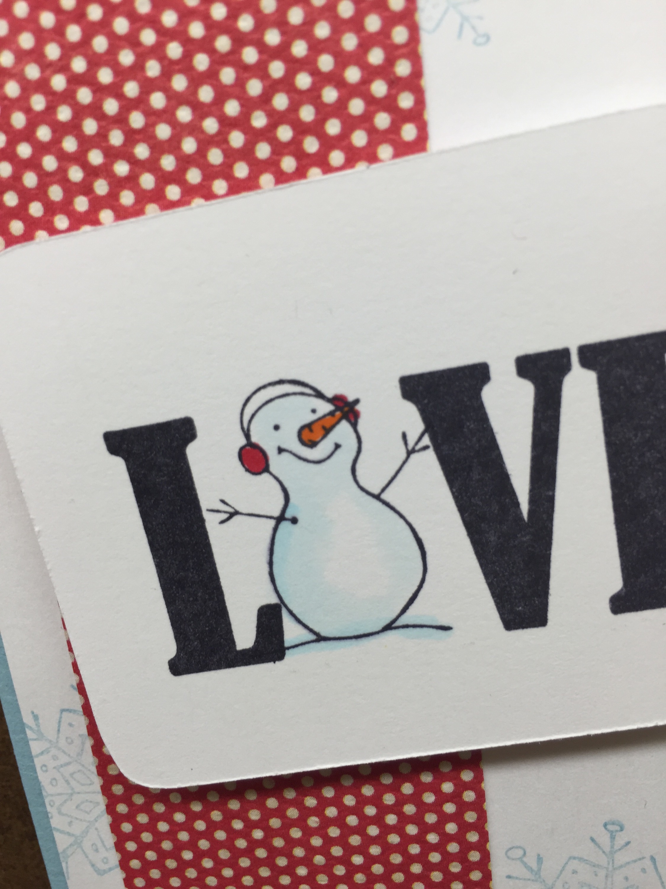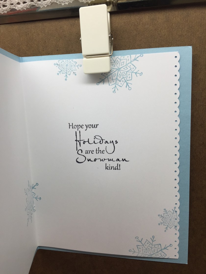 Stamps Used: A212 KB’s Snowflake Small; C171 KB’s Snowflake Med; C218 Think Snow; CC64 KB’s Ear Muff Snowman; D275 Holidays Snowman Kind; E252 Open Love