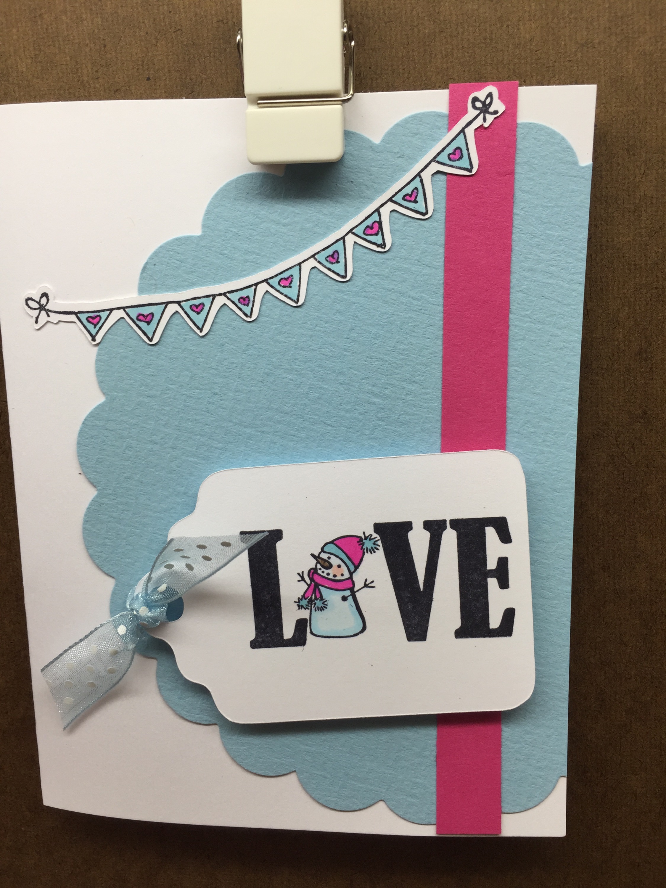 Stamps Used: BB22 Snow Fun Cube;BB51 KB’s Snowman Mini; E252 Open Love; F233 snowman wish; H123 KB’s Heart Banner