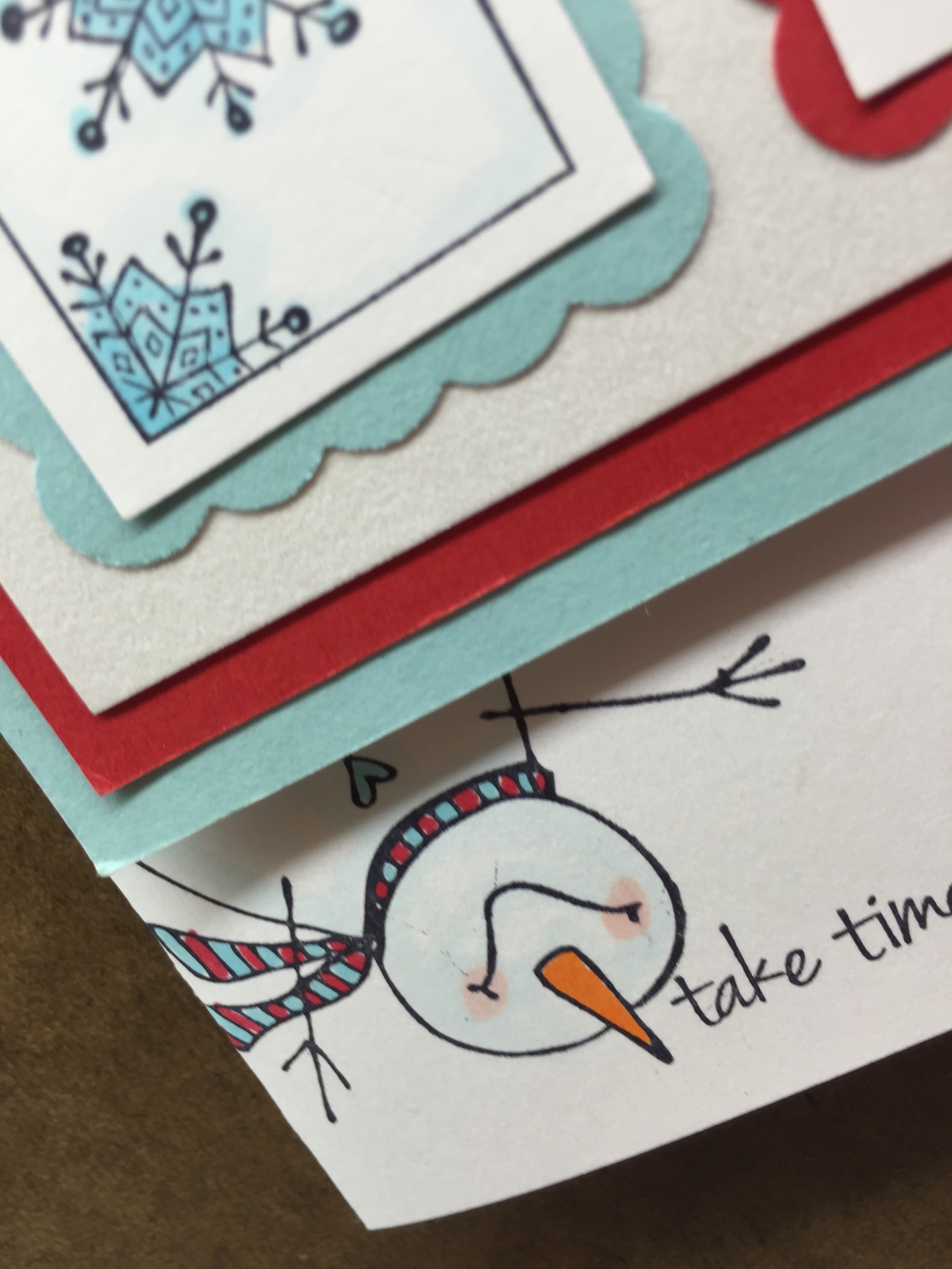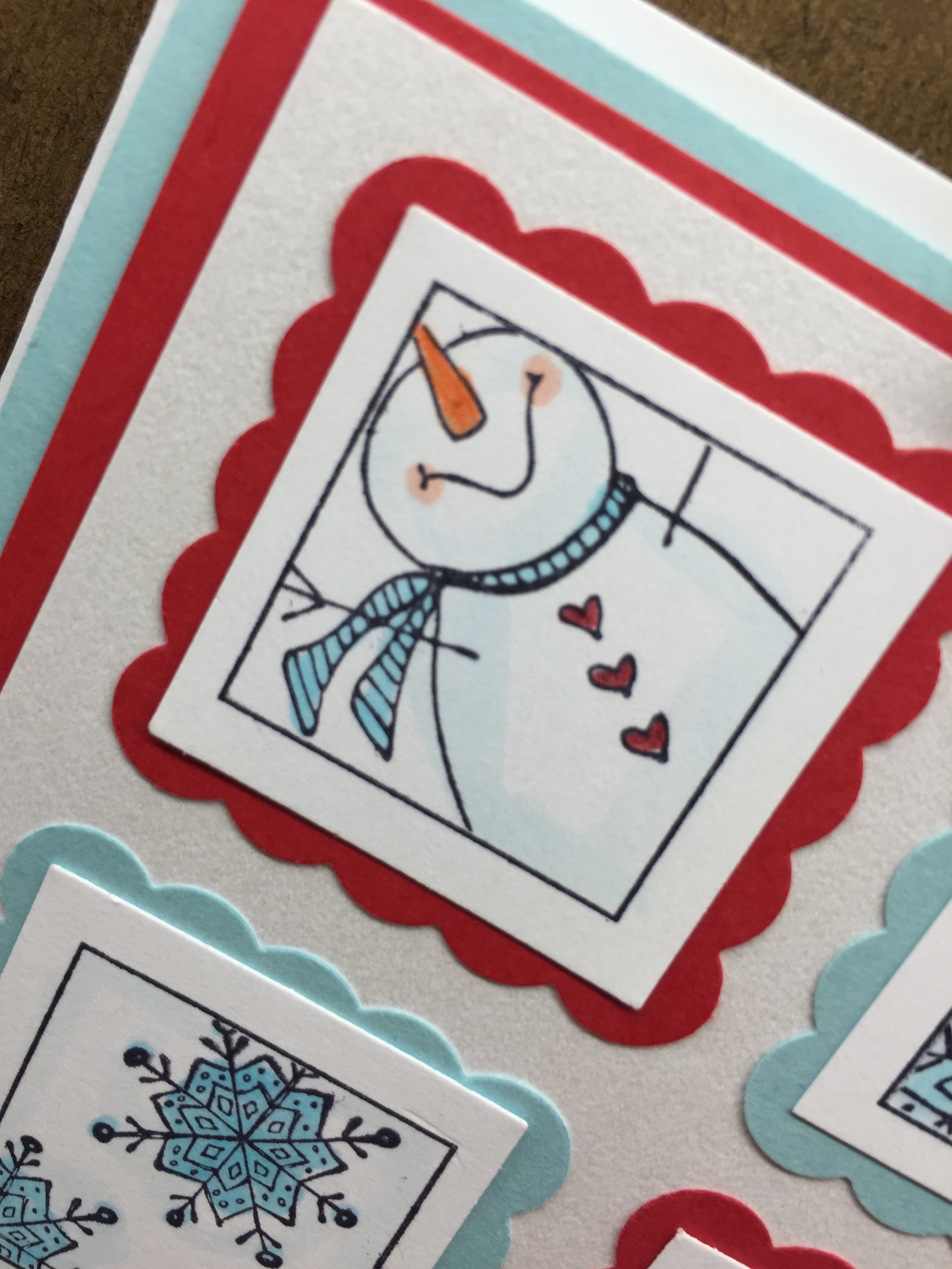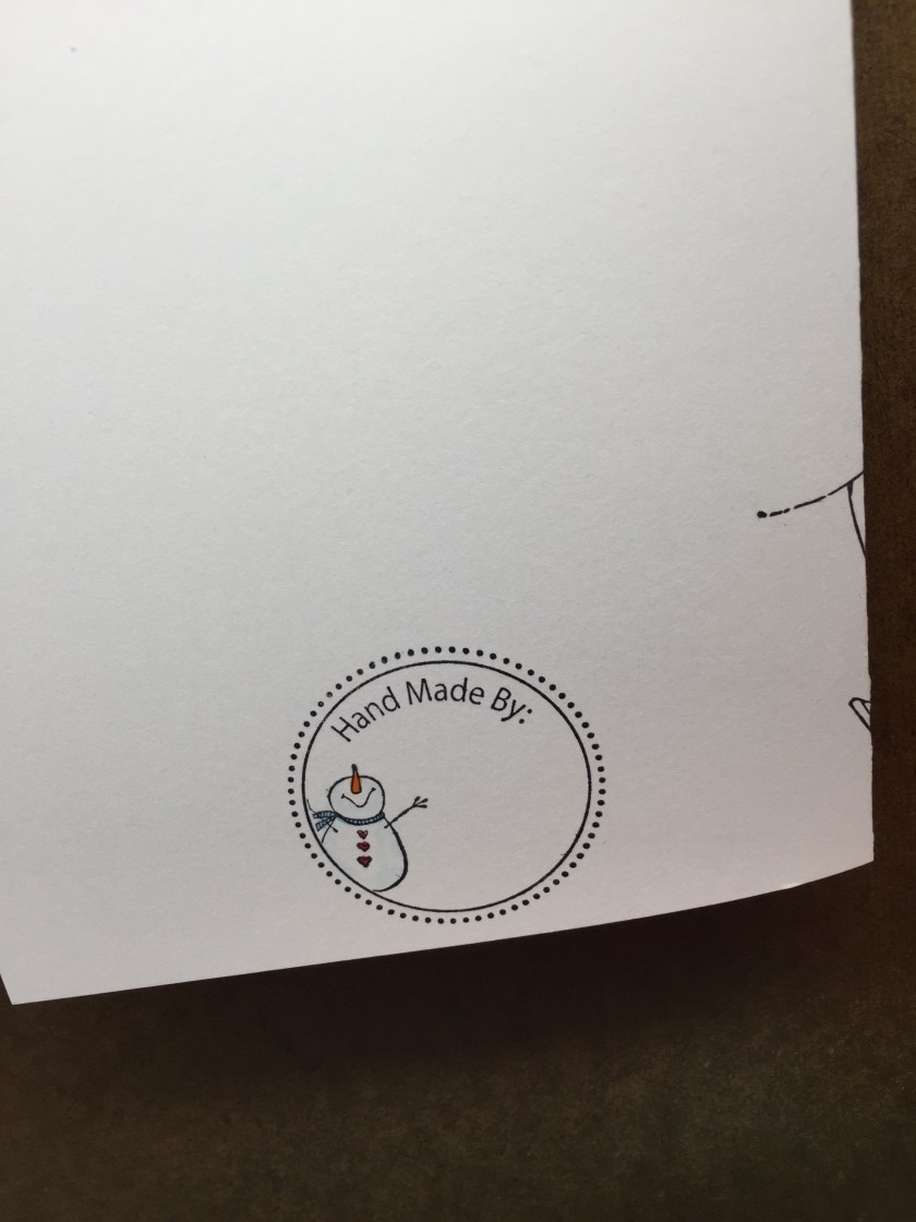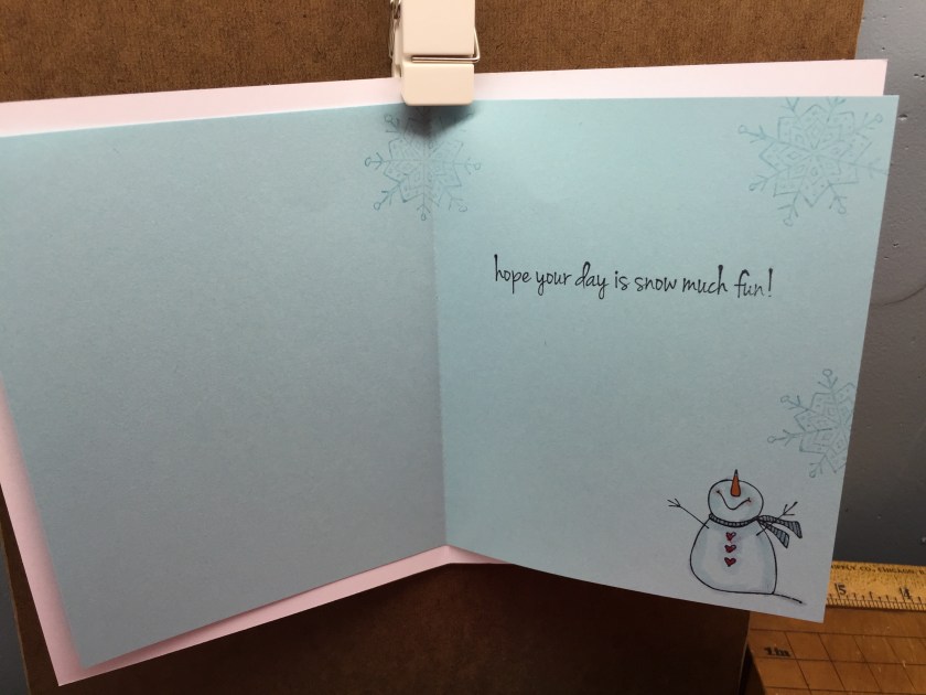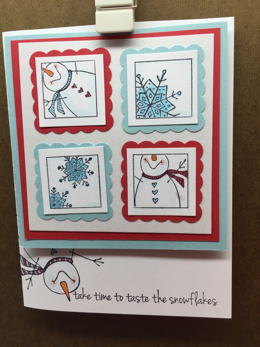 Stamps Used: A212 KB’s Snowflake SM; C171 KB’s Snowflake Med; CC58 KB’s Snowman Looking up mini; EE42 KB’s Snowman Looking Up Med; FF36 KB’s Snowflake Looking Up LG; B121 Open Square One Inch; E262 Taste Snowflakes; E262 Day Snow Much Fun; C196 Handmade Circle;