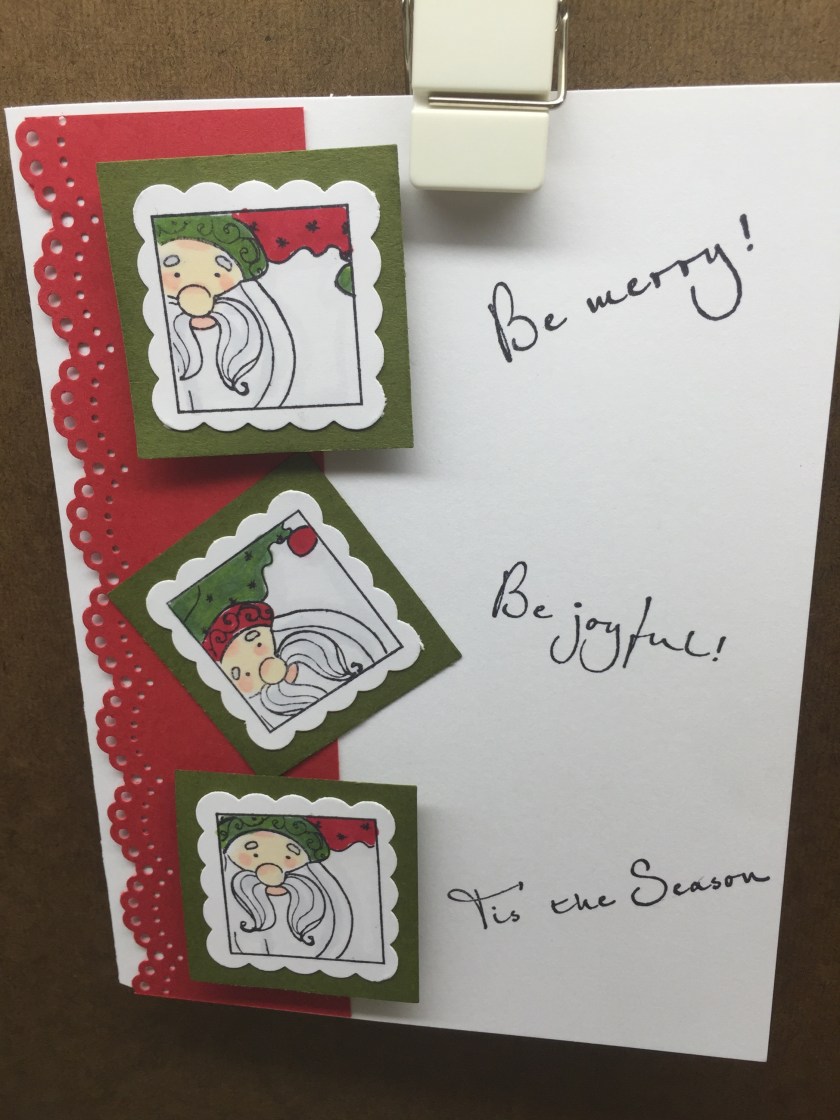 Today’s card has also been added to Make N Takes. Stamps Used: B121 Open square; B236 KB’s St Nick Mini; B250 single holly; C215 Be merry; C217 Be Joyful; C219 Tis the Season; D233 KB’s St Nick Med; E209 Christmas C197 hand stamped Rectangle ;