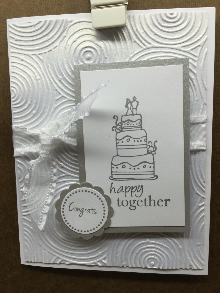 We are excited to soon be “back on the road”! We have added some cards to the Make n Takes…a graduation, wedding, and baby. Today’s card is the Wedding.