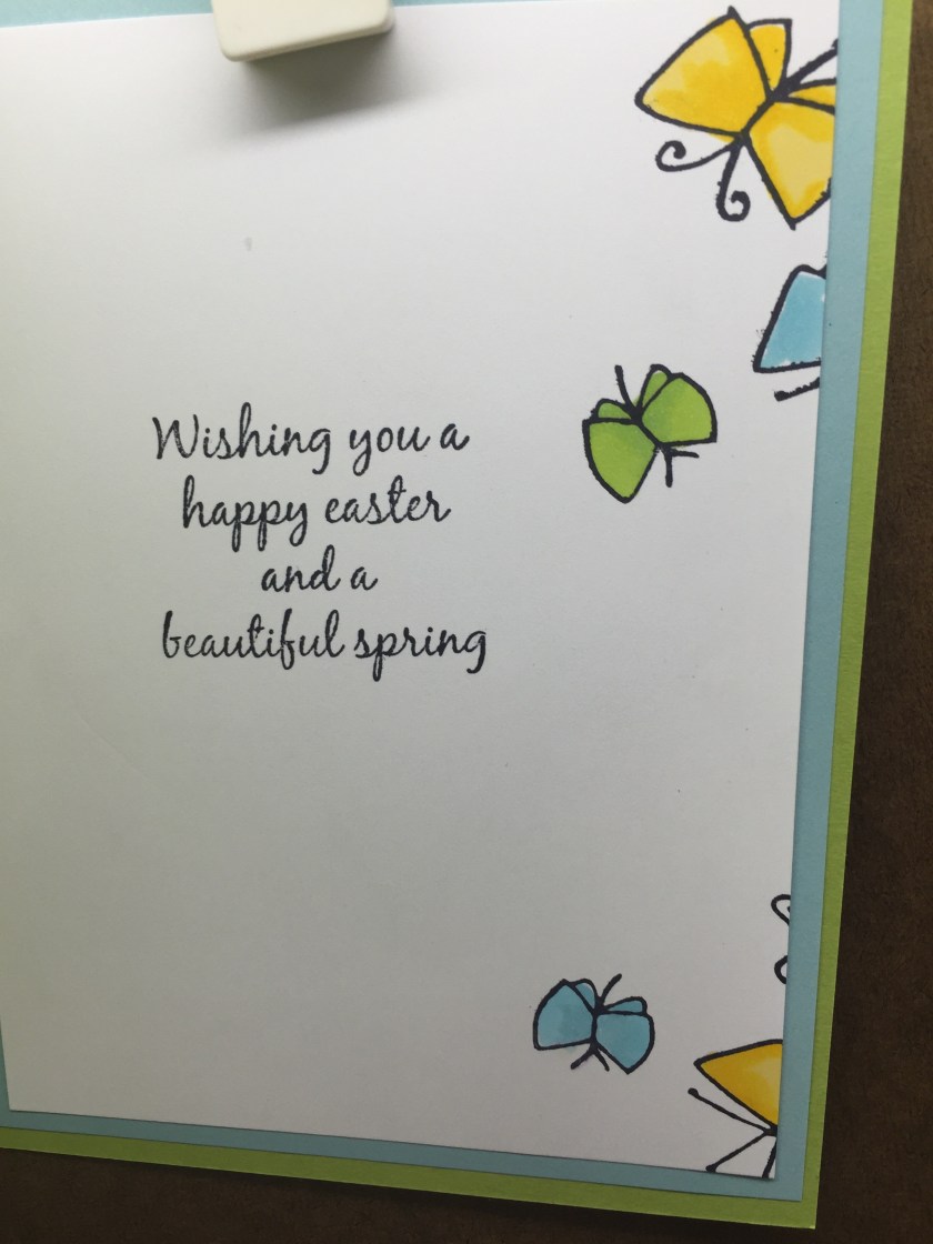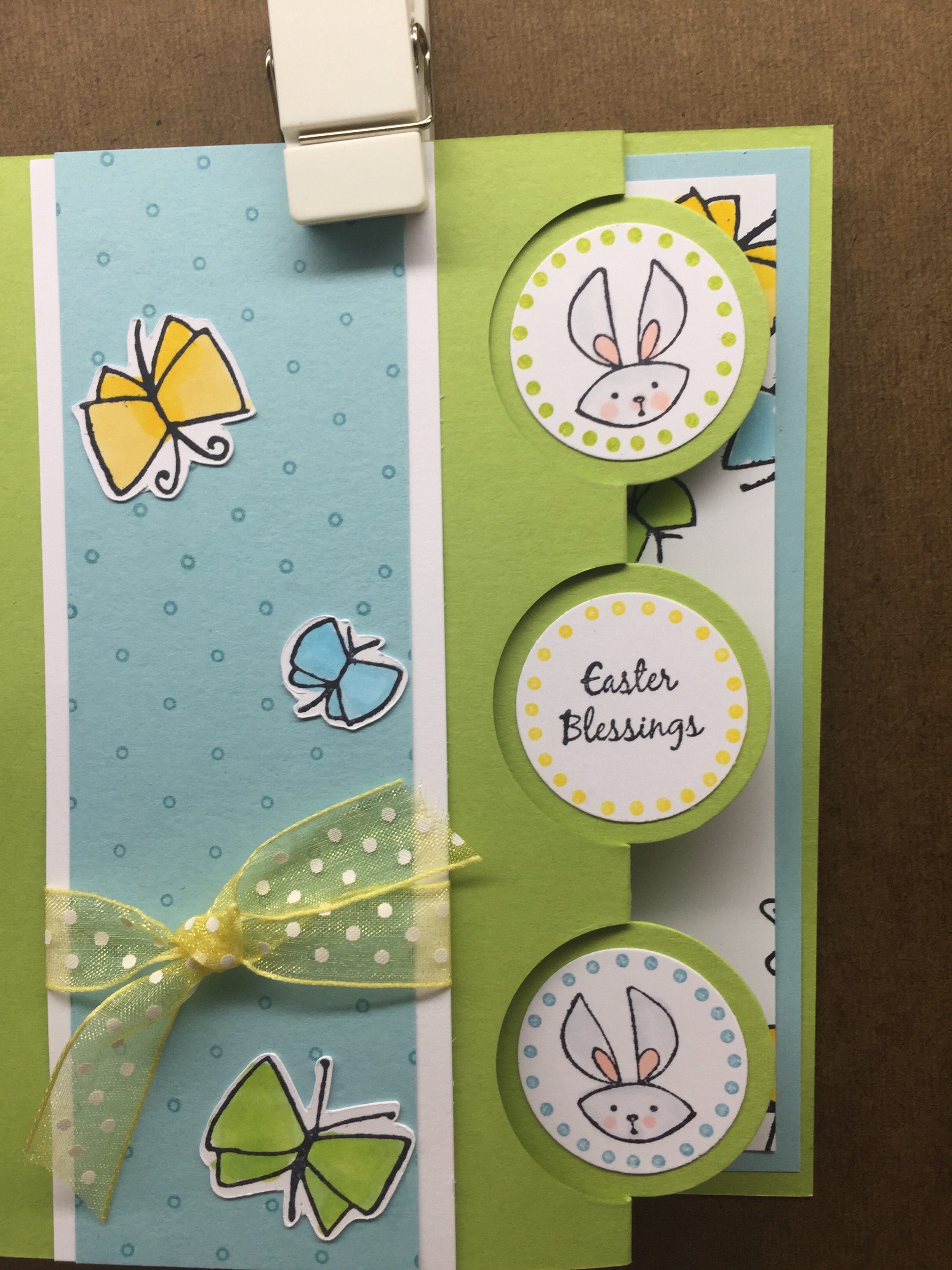 Stamps Used:  DD21 Old Dots & circle; CC72 KB’s Bunny Head sm; DD80 Easter Fun Cube; D311 Wishing Easter; G141 Open Dots; AA31 mini butterflies; D299 Trio Butterflies; D216 Handmade Circle;