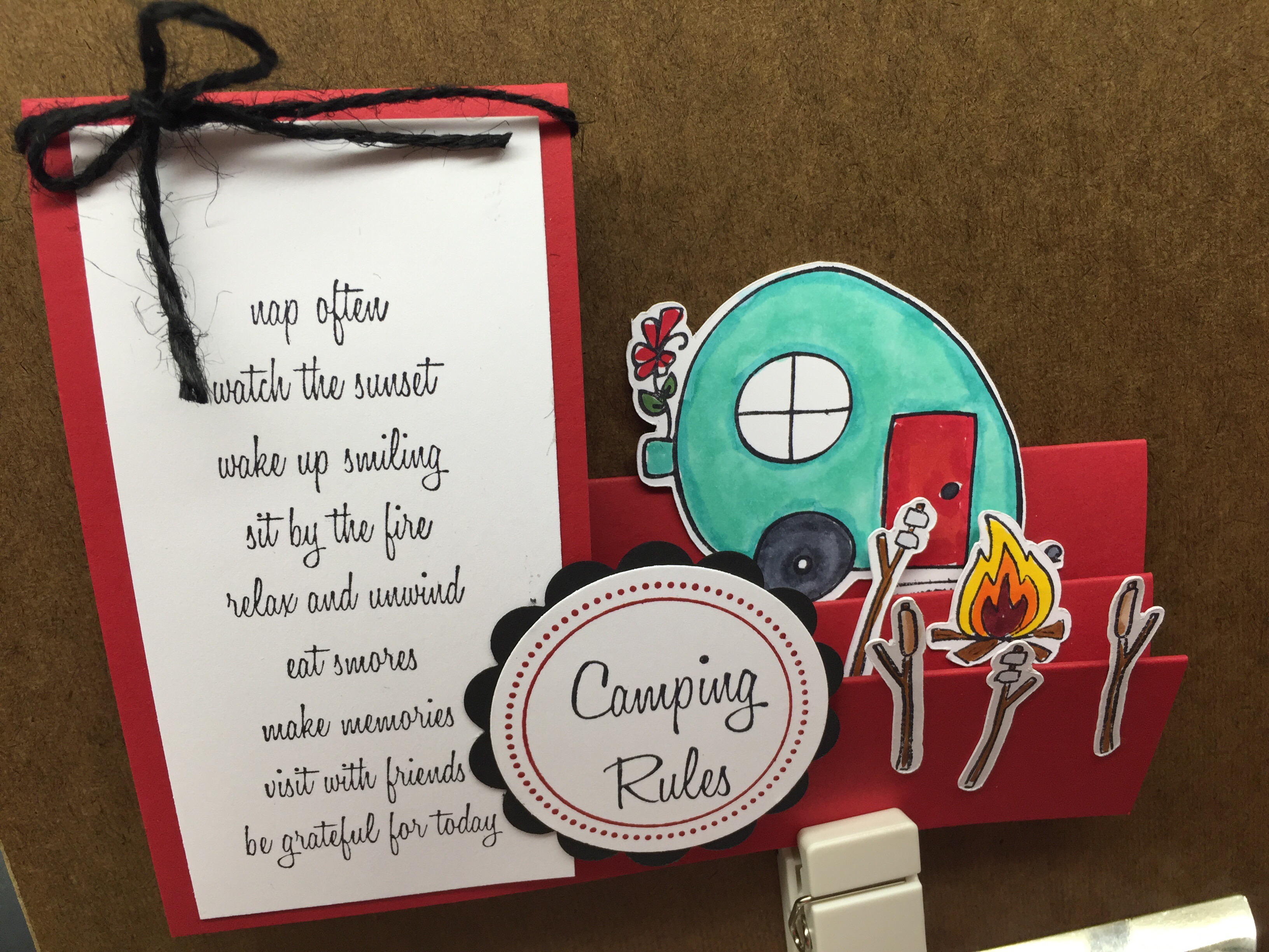 Stamps Used: BB61 Marshmellow Stick; BB62 Hot Dog Stick; CC76 Campfire; H130 Camping Rules; GG37 KB’s Camper Lg; EE41 Dots & Lines;