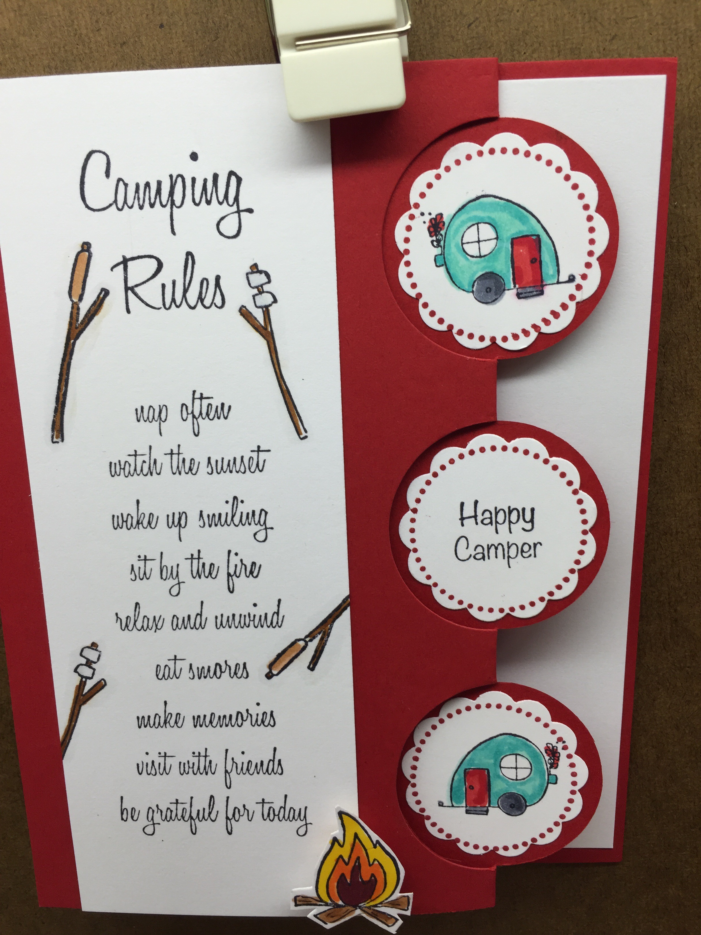 Stamps Used: Camping Rules; BB61 Marshmallow Sticks; BB62 Hot Dog Stick; CC75 KB’s Camper Mini; DD84 Camping Fun Cube; DD63 Dots & Lines; CC76 KB’s Campfire;