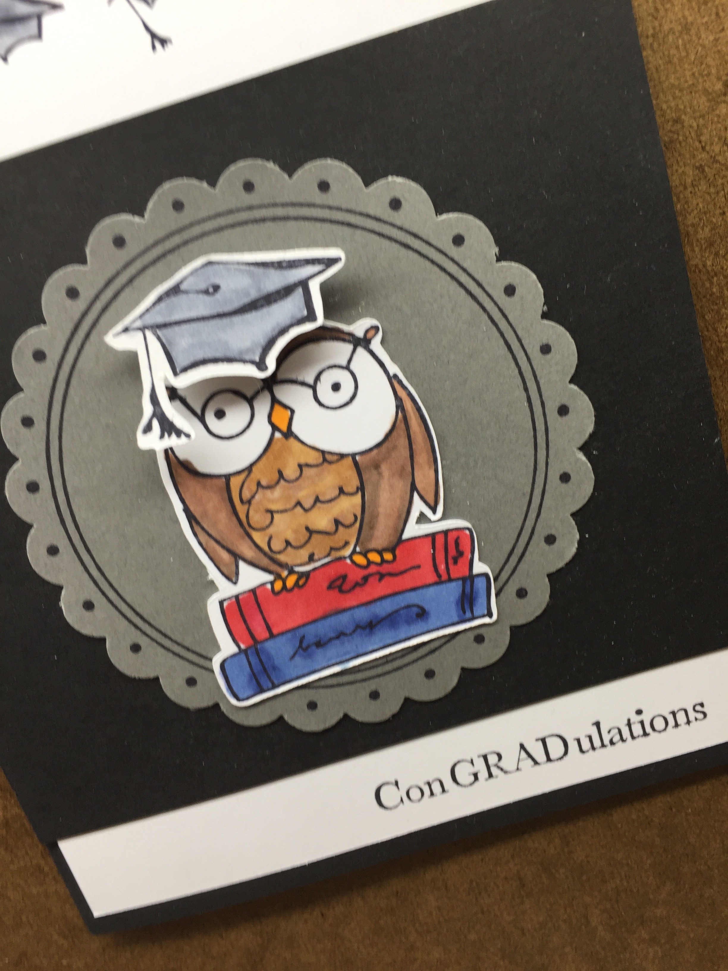 Stamps Used: H117 Swiss Dot Giga Circle; D187 Graduation Cap; C234 Con Grad ulations; H125 Graduation Cap Border; E256 KB’s Bookish Owl;