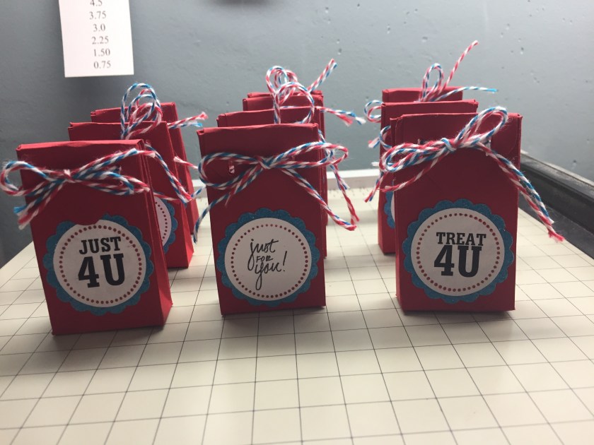 Hello…I’ve been working on a treat holder for our 2017 Friday Night Make n Take project. This is one I came up with but we only have 15 minutes so I’m not sure it’s going to work. They are fun to make though π